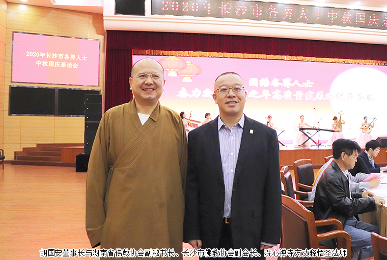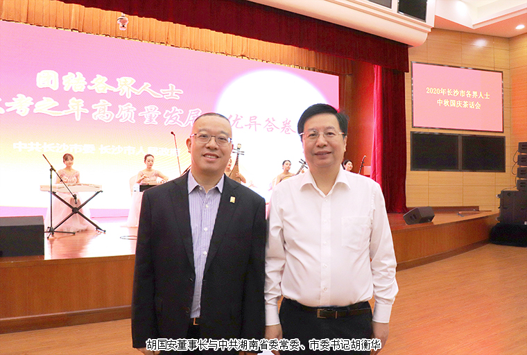 2020年9月28日,由中共長(zhǎng)沙市委、長(zhǎng)沙市政府主辦的2020年長(zhǎng)沙市各界人士中秋國(guó)慶茶話會(huì)在長(zhǎng)沙市會(huì)議中心召開。中共湖南省委常委、長(zhǎng)沙市委書記胡衡華,長(zhǎng)沙市人大常委會(huì)黨組書記、主任謝衛(wèi)東,長(zhǎng)沙市政協(xié)黨組書記、主席文樹勛,中共長(zhǎng)沙市委常委、統(tǒng)戰(zhàn)部部長(zhǎng)譚小平以及全市離退休老同志、各界人士共同出席活動(dòng)。湖南省政協(xié)委員、香港長(zhǎng)沙聯(lián)誼會(huì)名譽(yù)會(huì)長(zhǎng)、香港長(zhǎng)沙商會(huì)常務(wù)副會(huì)長(zhǎng)、綠之韻集團(tuán)董事長(zhǎng)胡國(guó)安受邀出席活動(dòng),與參會(huì)嘉賓歡聚一堂,共敘友情、共謀發(fā)展,共慶中秋佳節(jié)和中華人民共和國(guó)成立71周年。