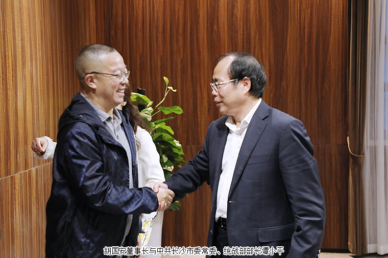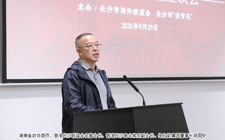 2020年9月29日,由長沙市海外聯(lián)誼會、長沙市“僑夢苑”主辦的全市港澳僑企座談會在長沙召開。中共長沙市委常委、統(tǒng)戰(zhàn)部部長譚小平,中共長沙市委統(tǒng)戰(zhàn)部副部長饒福明出席會議。湖南省政協(xié)委員、香港長沙聯(lián)誼會名譽會長、香港長沙商會常務(wù)副會長、綠之韻集團董事長胡國安受邀參加會議,與全市38家重點港澳僑企代表歡聚一堂、共敘情誼、共謀發(fā)展。
