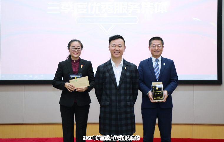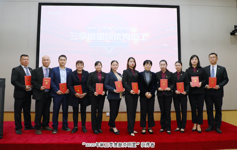 為表彰先進(jìn)、凝聚力量,進(jìn)一步激勵(lì)全體員工的積極性和奮斗激情,大會(huì)集中頒發(fā)了“三季度優(yōu)秀服務(wù)集體”“三季度服務(wù)明星”“五年服務(wù)英才獎(jiǎng)”“十年服務(wù)忠誠(chéng)獎(jiǎng)”等獎(jiǎng)項(xiàng)。傭金結(jié)算中心、新聞信息中心榮獲“2020年第三季度優(yōu)秀服務(wù)集體”稱號(hào),喻鳴鸞、靳威、楊邢軒、李向宇、王雪、牛小紅、戴明玉、林智文、李思、夏丹、劉偉、李克戰(zhàn)、戴明勇、蘇銅、肖巧林被評(píng)為“2020年第三季度星級(jí)優(yōu)秀員工”,綠之韻集團(tuán)副總裁劉淑娟、總經(jīng)理劉維利為獲獎(jiǎng)部門(mén)代表及個(gè)人頒獎(jiǎng)。肖波、曾夢(mèng)繁、朱麗妍、張婭、蘇妍、陳苗、張煜軒、劉博、吳冬梅、李星麗、牛小紅、孟慶玲、袁新星、張琳、鄧金林、劉伏海榮膺“五年服務(wù)英才獎(jiǎng)”,張曉芳、周金霖、盛夏、高素丹、彭姣、高芳榮膺“十年服務(wù)忠誠(chéng)獎(jiǎng)”,綠之韻集團(tuán)董事總裁勞嘉、副總裁胡均安先后上臺(tái)為獲獎(jiǎng)員工頒發(fā)獎(jiǎng)?wù)屡c榮譽(yù)證書(shū),并致以熱烈祝賀?!拔迥攴?wù)英才獎(jiǎng)”代表肖波和“十年服務(wù)忠誠(chéng)獎(jiǎng)”代表周金霖分別發(fā)表獲獎(jiǎng)感言。