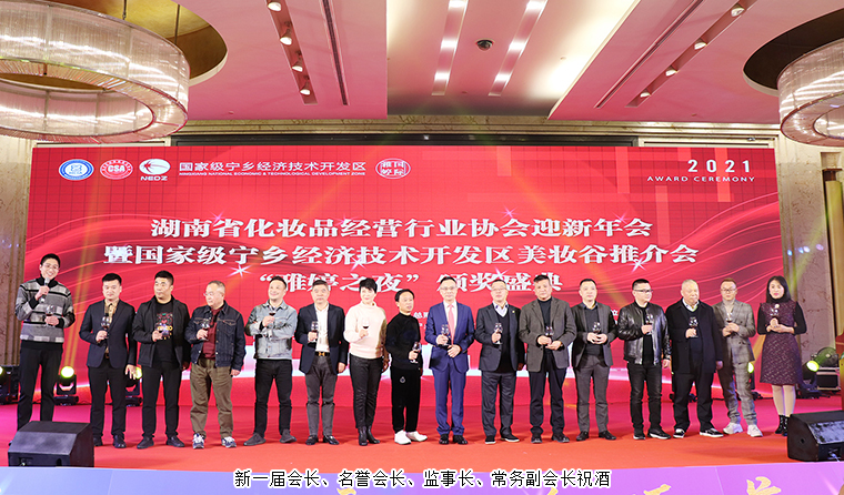 當(dāng)晚,還舉行了湖南省化妝品經(jīng)營行業(yè)協(xié)會迎新年會。湖南省化妝品經(jīng)營行業(yè)協(xié)會新一屆會長、名譽會長、監(jiān)事長、常務(wù)副會長等領(lǐng)導(dǎo)班子成員上臺祝酒。晚宴現(xiàn)場為本年度行業(yè)內(nèi)表現(xiàn)突出、取得優(yōu)異成績的會員企業(yè)頒獎。綠之韻生物工程集團(tuán)有限公司獲評“20年功勛企業(yè)”榮譽稱號。