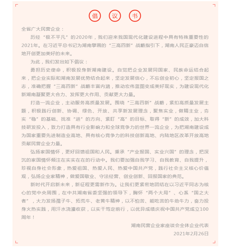 新時(shí)代開(kāi)啟新未來(lái),新征程更需新作為。2021年2月26日,在正月十五元宵節(jié)到來(lái)之際,湖南省政府召開(kāi)民營(yíng)企業(yè)家座談會(huì)。中共湖南省委副書(shū)記、省長(zhǎng)毛偉明,省委常委、統(tǒng)戰(zhàn)部部長(zhǎng)黃蘭香,省委常委、常務(wù)副省長(zhǎng)謝建輝,湖南省政協(xié)副主席、省工商聯(lián)主席張健等領(lǐng)導(dǎo)以及有關(guān)省直和中央駐長(zhǎng)單位負(fù)責(zé)人出席會(huì)議。三一集團(tuán)董事長(zhǎng)梁穩(wěn)根、藍(lán)思科技董事長(zhǎng)周群飛、山河智能董事長(zhǎng)何清華、鹽津鋪?zhàn)佣麻L(zhǎng)張學(xué)武、綠之韻集團(tuán)董事長(zhǎng)胡國(guó)安等40位湖南知名民營(yíng)企業(yè)家受邀參加座談會(huì)。