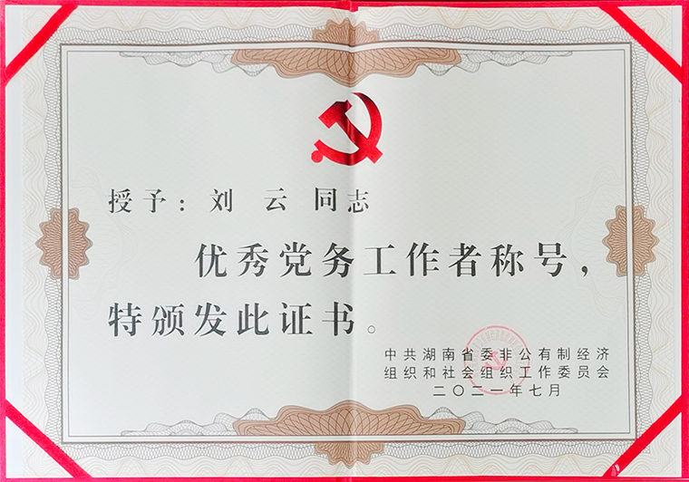此次榮獲湖南省兩新領(lǐng)域“優(yōu)秀黨務(wù)工作者”榮譽,劉云書記表示,這是一份榮譽,更是一份責任。今年正值中國共產(chǎn)黨建黨100周年,黨史學(xué)習教育正當其時,集團黨委開展了一系列“學(xué)史明理、學(xué)史增信、學(xué)史崇德、學(xué)史力行”活動,在集團上下掀起了黨史學(xué)習的熱潮。如今站在新的歷史征程上,我們要更加緊密團結(jié)在以習近平同志為核心的黨中央周圍,認真學(xué)習貫徹習近平總書記在慶祝中國共產(chǎn)黨成立100周年大會上的重要講話精神,不忘初心、牢記使命,扎實開展黨史學(xué)習教育。綠之韻集團黨委將繼續(xù)強化黨建引領(lǐng)工作,充分發(fā)揮黨組織的戰(zhàn)斗堡壘作用和黨員的先鋒模范作用,以實際成效推動企業(yè)發(fā)展邁上新臺階、展現(xiàn)新作為,為全省大力實施“三高四新”戰(zhàn)略,奮力建設(shè)現(xiàn)代化新湖南貢獻智慧和力量,用實實在在的發(fā)展成果向建黨100周年獻禮。