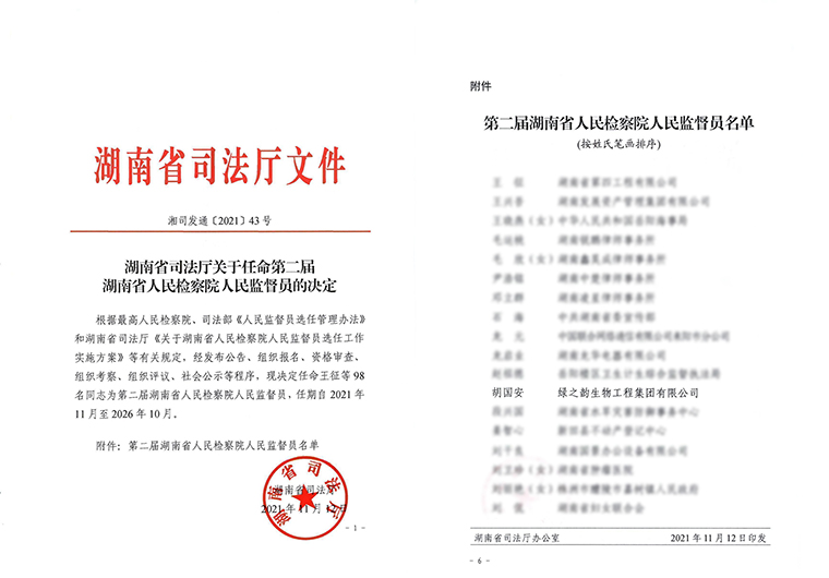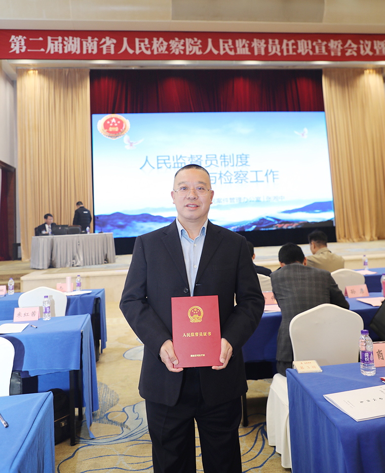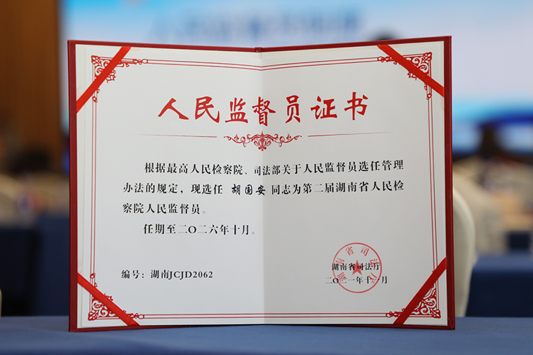 會上,湖南省司法廳黨組成員、政治部主任雷豐超宣讀了任命決定。綠之韻集團(tuán)董事長胡國安等九十八名同志被任命為第二屆湖南省人民檢察院人民監(jiān)督員,任期自2021年11月至2026年10月。會議為第二屆湖南省人民檢察院人民監(jiān)督員頒發(fā)聘書,全體人民監(jiān)督員進(jìn)行宣誓。