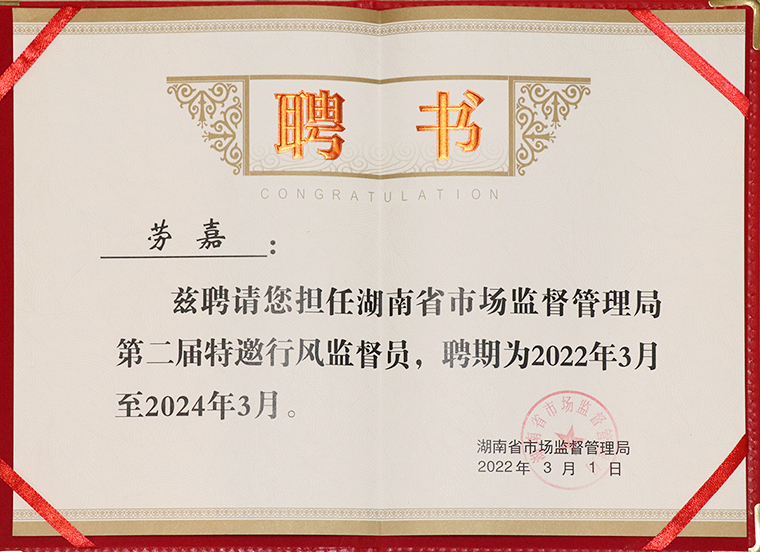 2022年3月3日,湖南省市場監(jiān)督管理局召開全省市場監(jiān)管系統(tǒng)黨風(fēng)廉政建設(shè)工作會議。湖南省市場監(jiān)督管理局黨組書記、局長向曙光,黨組成員、省藥監(jiān)局黨組書記梁毅恒,副局長李沐,省紀(jì)委監(jiān)委駐省局紀(jì)檢監(jiān)察組組長秦繼紅等領(lǐng)導(dǎo)出席會議。綠之韻集團(tuán)董事、總裁勞嘉受邀參會,并被續(xù)聘為湖南省市場監(jiān)督管理局第二屆特邀行風(fēng)監(jiān)督員。