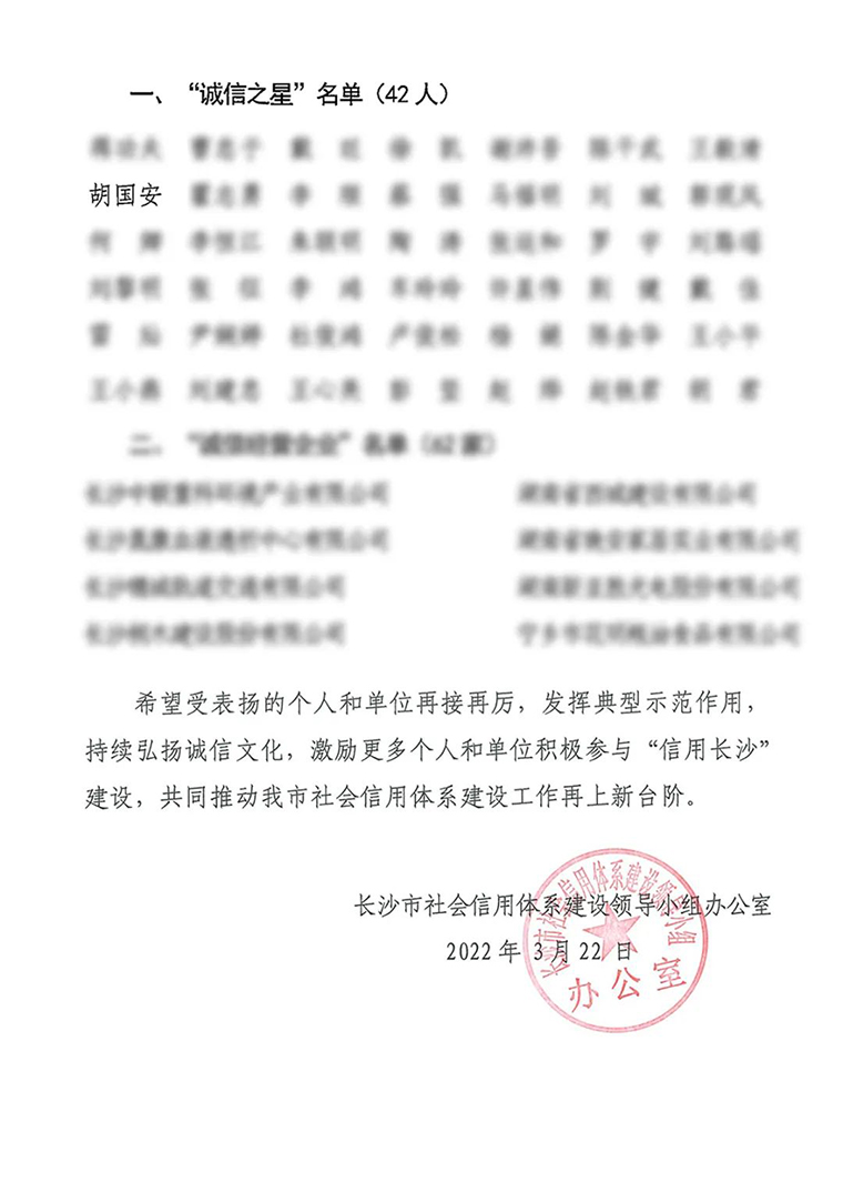 據(jù)了解,“誠信之星”“誠信經(jīng)營企業(yè)”評選活動是全面推進(jìn)長沙市社會信用體系建設(shè),大力弘揚(yáng)社會主義核心價值觀,進(jìn)一步加強(qiáng)社會誠信建設(shè)的有力措施。此次,評選活動通過宣傳發(fā)動、各單位推薦、組織評審、社會監(jiān)督多個環(huán)節(jié),經(jīng)長沙市社會信用體系建設(shè)領(lǐng)導(dǎo)小組綜合評定最終決出信用示范單位7家,誠信經(jīng)營企業(yè)62家,誠信行業(yè)協(xié)會、商會11家,優(yōu)秀信用服務(wù)機(jī)構(gòu)2家以及誠信之星42名。