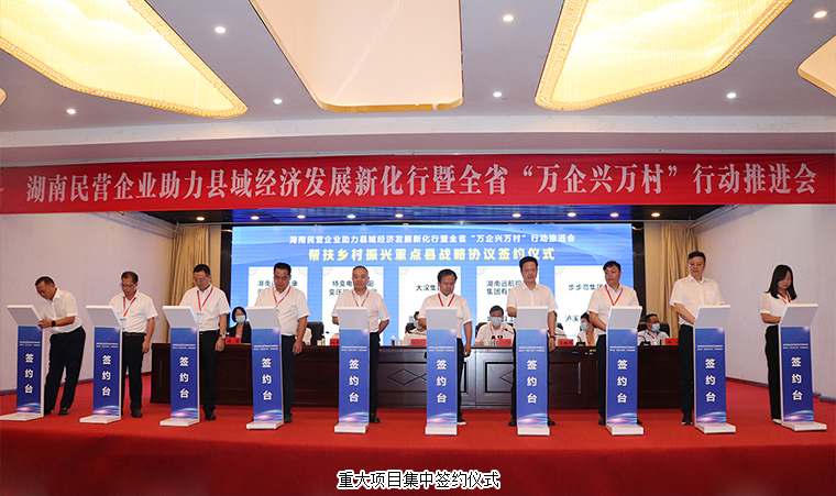 會上,進行了關(guān)于“幫扶千村 破零倍增”重點幫扶集體經(jīng)濟薄弱村專項行動和關(guān)于“民企興縣 跨越同行”助力鄉(xiāng)村振興重點幫扶縣專項行動文件的說明;公布了幫扶新化縣100個薄弱村的民營企業(yè)和商協(xié)會名單;簽訂了全省“萬企興萬村”行動示范項目9個、幫扶新化縣項目10個,涵蓋農(nóng)產(chǎn)品種植、鄉(xiāng)村旅游、美麗鄉(xiāng)村建設(shè)等方面,總投資超14億元。參與“民企興縣 跨越同行”行動的150個企業(yè)、商協(xié)會與全省15個鄉(xiāng)村振興重點幫扶縣簽訂了《幫扶鄉(xiāng)村振興重點縣戰(zhàn)略協(xié)議》。100個民營企業(yè)和商協(xié)會與100個幫扶新化縣薄弱村簽訂結(jié)對協(xié)議。會議還表揚了一批在“商會進新化 黨員聯(lián)鄉(xiāng)村”行動中的優(yōu)秀商協(xié)會黨組織。簽約儀式上,勞嘉總裁代表綠之韻集團與安化縣工商聯(lián)就鄉(xiāng)村振興建設(shè)工作簽訂了戰(zhàn)略協(xié)議。