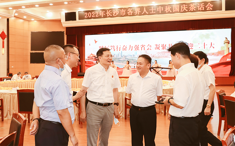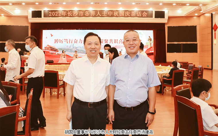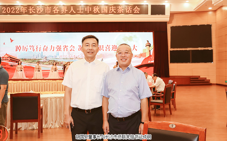 2022年9月9日,由中共長沙市委、長沙市政府主辦的2022年長沙市各界人士中秋國慶茶話會在長沙舉行。中共湖南省委常委、長沙市委書記吳桂英,市委副書記、湖南湘江新區(qū)黨工委書記、岳麓區(qū)委書記譚勇,市政協(xié)黨組書記、主席陳剛,市委常委、市紀(jì)律檢查委員會書記、市監(jiān)察委員會主任胡衛(wèi)兵,市委常委、長沙警備區(qū)政治委員馮紫英,市委常委、市委秘書長劉擁兵,市委常委、統(tǒng)戰(zhàn)部長、市政協(xié)黨組副書記劉匯等領(lǐng)導(dǎo)出席活動。長沙市人大代表、湖南省長沙市光彩事業(yè)基金會理事長、香港長沙聯(lián)誼會名譽(yù)會長、綠之韻集團(tuán)董事長胡國安與全市離退休老同志、各界人士代表歡聚一堂,飲一杯清茶,道一聲祝福,話一方發(fā)展。