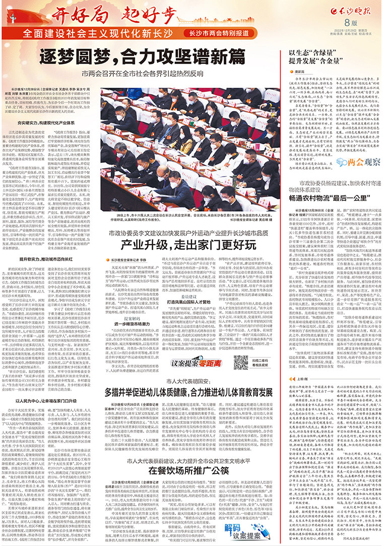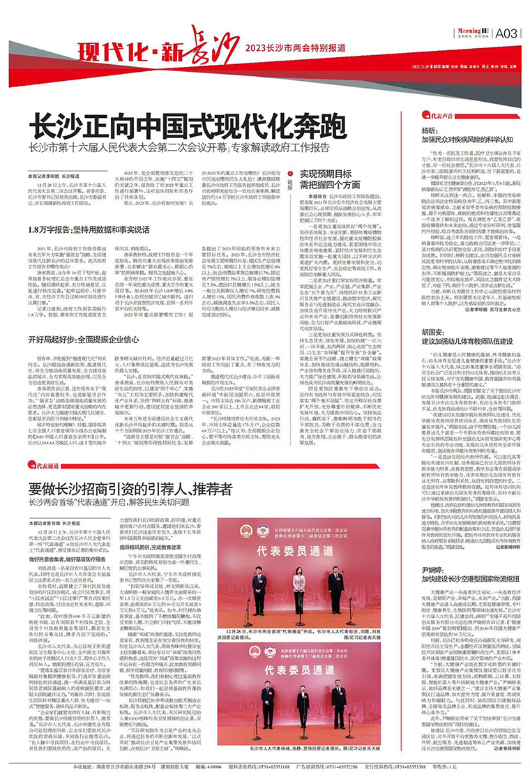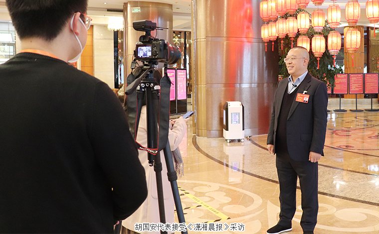 凝心聚力謀發(fā)展,砥礪奮進譜華章?!敖裉煸诖髸F場認真聆聽了市長所作的政府工作報告,倍受鼓舞,深受啟發(fā),更是充滿信心。整個報告對長沙過去的一年做了全面、客觀的總結,各行各業(yè)、各個領域都取得了非常好的成績,這是非常來之不易的。同時,也對長沙未來一年的工作做了科學的規(guī)劃,擘畫了宏偉的藍圖。報告總結成績有高度,分析問題有深度,部署工作有力度,關注民生有溫度。作為人民代表,我們要深入學習宣傳貫徹二十大精神,切實履職盡責,為建設現代化新長沙作出努力和貢獻!”胡國安代表在接受《瀟湘晨報》、《長沙晚報》、長沙新聞頻道等多家媒體采訪時,難掩內心的激動與振奮。