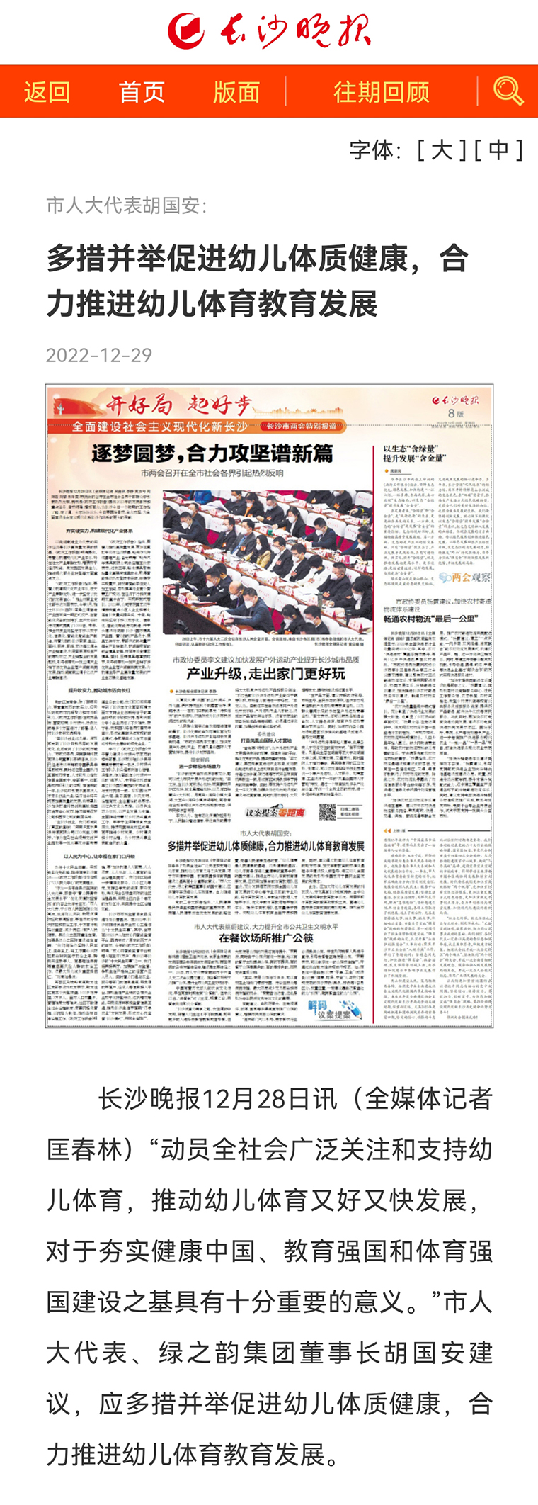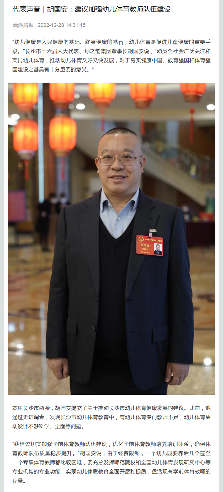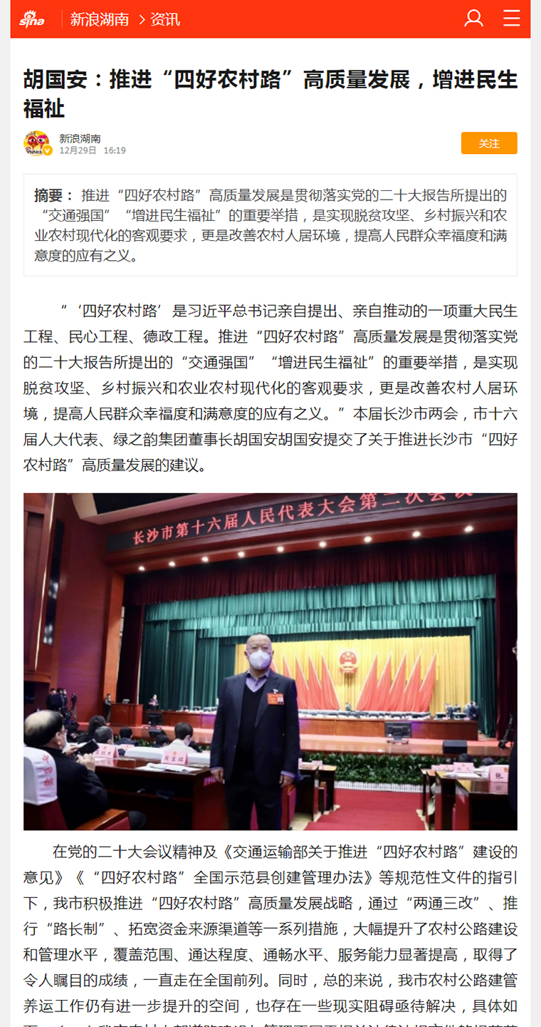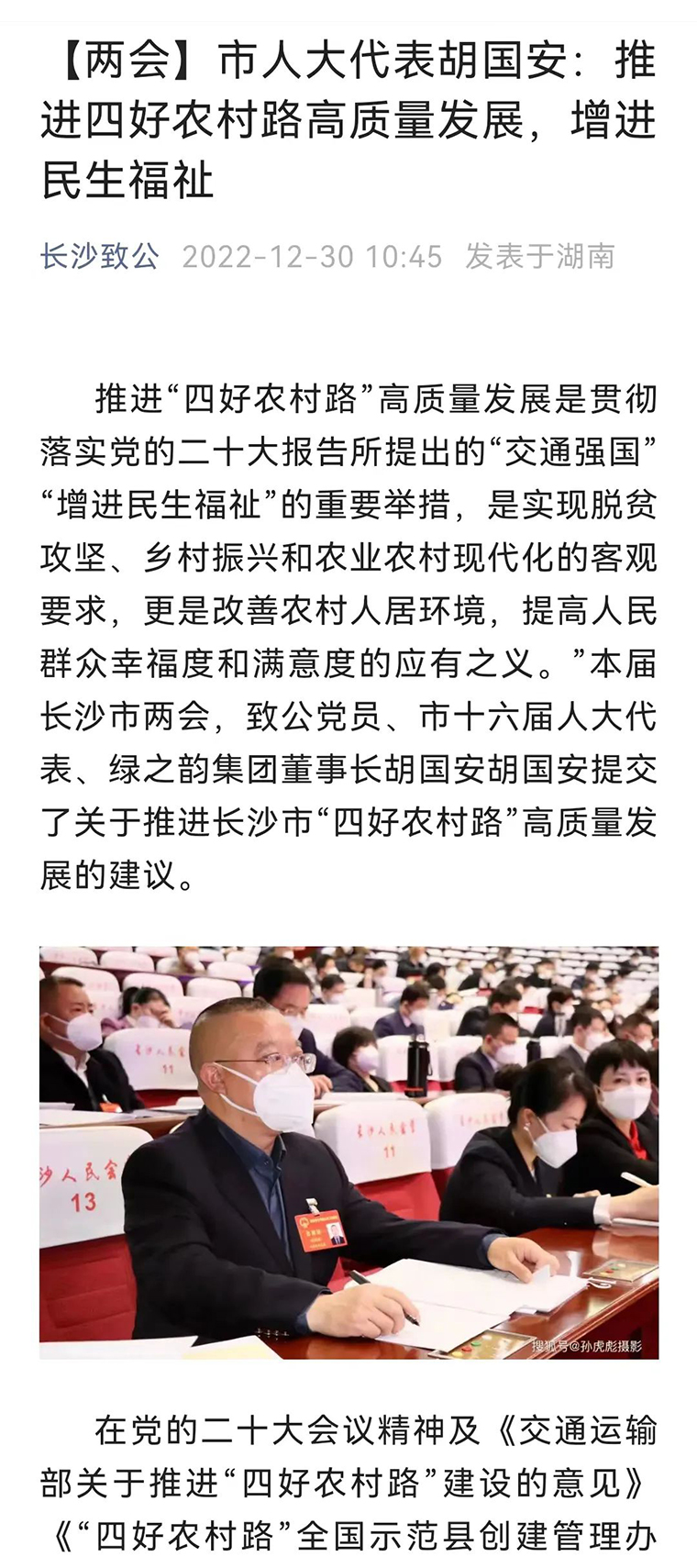 闊步新征程,建功新時代!2022年是黨和國家發(fā)展進程中具有重要里程碑意義的一年,是長沙極不尋常、極不平凡的一年,也是胡國安代表與各條戰(zhàn)線代表們共同依法履職的開局之年。這一年以來,胡國安代表在市人大及其常委會領導下,積極參加長沙市人大“鄉(xiāng)村振興長沙行”、“長株潭交通一體化規(guī)劃與重點項目”、“聚焦強省會戰(zhàn)略,助推高質量發(fā)展”、“平安建設”等重點項目調研和視察活動,踐行了“人民選我當代表、我當代表為人民”的莊嚴承諾。2023年是長沙現代化征程戰(zhàn)略機遇和困難挑戰(zhàn)并存的重要窗口期,堅定的信心、頑強的斗志比以往任何時期都更重要。作為在長沙這片沃土上成長起來的民營企業(yè),綠之韻將認真貫徹落實今年長沙“兩會”精神指示,準確把握所處發(fā)展階段,奮力擔當歷史使命,穩(wěn)住向上向好發(fā)展態(tài)勢,全領域、全方位、全過程貫徹高質量的發(fā)展要求,深入推進“大品牌+大健康+大金融”的發(fā)展戰(zhàn)略,聚焦實業(yè),做精主業(yè),更加注重發(fā)展方式綠色轉型,更加注重激發(fā)干事創(chuàng)業(yè)活力,積極承擔企業(yè)公民責任,把企業(yè)發(fā)展腳步與鄉(xiāng)村振興工作進行有效銜接,緊緊圍繞全面落實“三高四新”戰(zhàn)略定位和使命任務、大力實施“強省會”戰(zhàn)略,創(chuàng)新實干,勇毅前行,為建設現代化新長沙作出更大的貢獻!