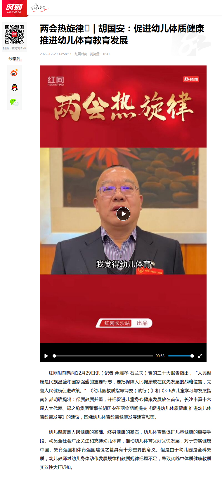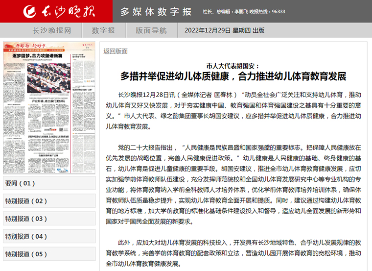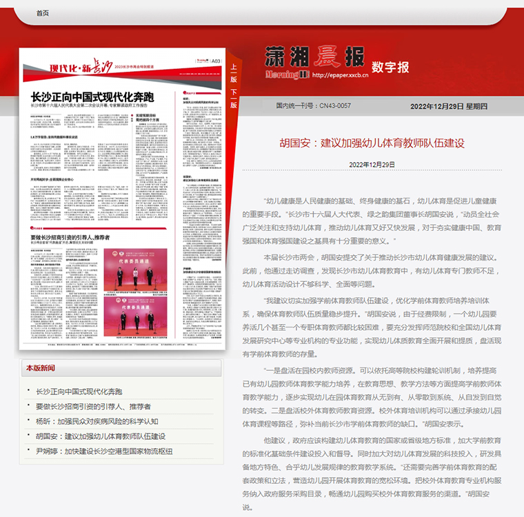 會議期間,胡國安代表廣泛同各界別代表們分別圍繞市委、市政府的中心工作,聚焦長沙現代化新征程和人民群眾普遍關心的重點問題,進行深入探討和交流。此次會議,他提交了《關于推進我市“四好農村路”高質量發(fā)展的建議》和《關于推進我市幼兒體育教育健康發(fā)展的建議》兩件議案。推進“四好農村路”高質量發(fā)展是貫徹落實黨的二十大報告所提出的“交通強國”“增進民生福祉”的重要舉措,是實現脫貧攻堅、鄉(xiāng)村振興和農業(yè)農村現代化的客觀要求,更是改善農村人居環(huán)境,提高人民群眾幸福度和滿意度的應有之義。胡國安代表建議要按照技術標準,推動農村內部道路建設升級;要加快立法調研,修訂《長沙市公路管理規(guī)定(2010)》;要拓寬籌資渠道,引導社會資本廣泛參與;要加強設計施工融合,探索推行EPC承包模式;要盡快專門立法,加強長沙市農村公路養(yǎng)護。《關于推進我市幼兒體育教育健康發(fā)展的建議》中,建議切實加強學前體育教師隊伍建設,優(yōu)化學前體育教師培養(yǎng)培訓體系,確保體育教師隊伍質量穩(wěn)步提升;政府應該構建幼兒體育教育的國家或省級地方標準,加大學前教育的標準化基礎條件建設投入和督導;加大對幼兒體育發(fā)展的科技投入,研發(fā)具備地方特色、合乎幼兒發(fā)展規(guī)律的教育教學系統;完善學前體育教育的配套政策和立法,營造幼兒園開展體育教育的寬松環(huán)境。胡國安代表今年的兩件議案,內容緊扣當前焦點熱點話題,受到與會代表的廣泛認同,引發(fā)多家新聞媒體聚焦報道。