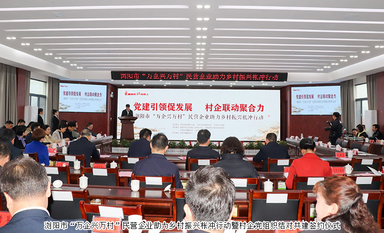 黨建引領(lǐng)促發(fā)展,村企聯(lián)動(dòng)聚合力。2023年3月23日,瀏陽市“萬企興萬村”民營企業(yè)助力鄉(xiāng)村振興棖沖行動(dòng)暨村企黨組織結(jié)對(duì)共建簽約儀式在瀏陽市棖沖鎮(zhèn)舉行。中共瀏陽市委副書記、統(tǒng)戰(zhàn)部部長戴武明,中共瀏陽市委常委、組織部部長唐安石,中共瀏陽市委常委、市委辦主任王坤球,瀏陽市人大常委會(huì)黨組成員、副主任唐洪勝,瀏陽市人民政府副市長劉來宏,瀏陽市政協(xié)副主席、市工商聯(lián)主席陳靜等領(lǐng)導(dǎo)出席活動(dòng)。瀏陽市相關(guān)單位和部門負(fù)責(zé)人,棖沖鎮(zhèn)全體黨政領(lǐng)導(dǎo),村黨總支書記、主任,鄉(xiāng)村振興駐村第一書記以及結(jié)對(duì)幫扶企業(yè)代表參加活動(dòng)。綠之韻集團(tuán)黨委書記劉云代表公司受邀參加活動(dòng)。