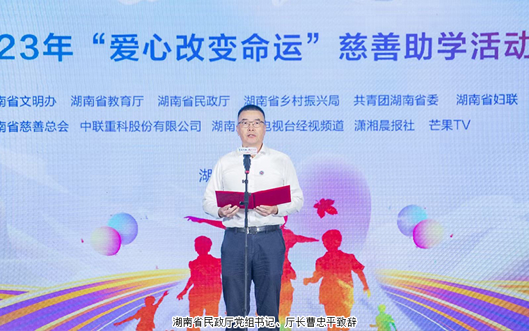 活動(dòng)現(xiàn)場(chǎng)播放了“愛(ài)心改變命運(yùn)”2023年主題視頻以及湖南14個(gè)市州慈善會(huì)助學(xué)成果視頻。湖南省民政廳黨組書(shū)記、廳長(zhǎng)曹忠平致辭。他在致辭中指出,慈善事業(yè)是一項(xiàng)獻(xiàn)愛(ài)心、暖人心、惠民生的崇高事業(yè)。人生之善莫過(guò)于助人,助人之德莫過(guò)于助學(xué),慈善助學(xué)是改變困境學(xué)子的希望霞光。他呼吁,社會(huì)各界攜起手來(lái),共同加入“愛(ài)心改變命運(yùn)”慈善助學(xué)行動(dòng),用博大的愛(ài)心澆灌未來(lái)。