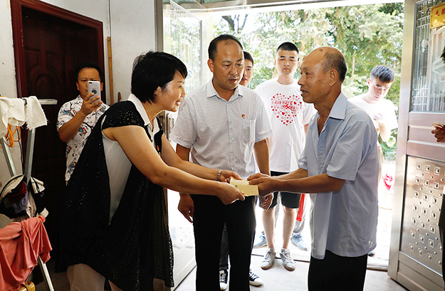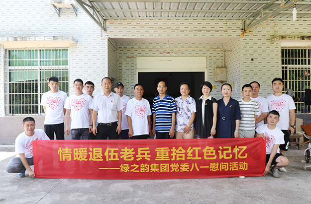 2019年7月31日,綠之韻集團黨委開展了“八一”走訪慰問退伍老兵活動。綠之韻集團黨委書記劉云、副總經(jīng)理夏運良、工會主席兼集團辦公室行政總監(jiān)馮紅、黨委副書記許達仲帶領著就職于集團的十余名退伍軍人前往洞陽鎮(zhèn)東園村,向退伍老兵送上慰問金和濃濃的節(jié)日祝福。
