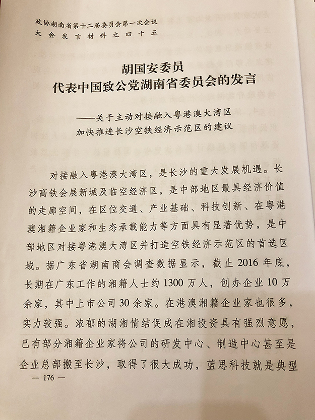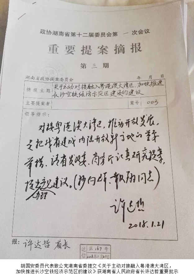 早在2018湖南省“兩會”期間,胡國安委員就代表致公黨湖南省委向大會提交了集體提案《關(guān)于主動對接融入粵港澳大灣區(qū)加快推進長沙空鐵經(jīng)濟示范區(qū)的建議》,獲湖南省人民政府省長許達哲重要批示,并受到中共湖南省委書記、省人大常委會主任杜家毫親切接見,多家媒體的持續(xù)聚焦報道。他認為,長沙高鐵會展新城及臨空經(jīng)濟示范區(qū)是中部地區(qū)最具經(jīng)濟價值的走廊空間,在區(qū)位交通、產(chǎn)業(yè)基礎(chǔ)、科技創(chuàng)新、在粵港澳湘籍企業(yè)家和生態(tài)承載能力等方面具有顯著優(yōu)勢,是中部地區(qū)對接粵港澳大灣區(qū)并打造空鐵經(jīng)濟示范區(qū)的首選區(qū)域。