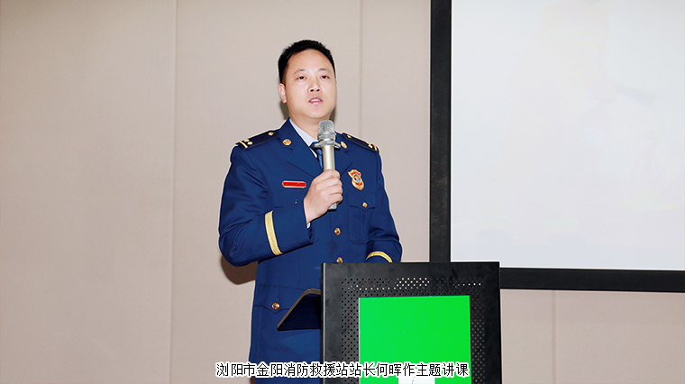 此次培訓(xùn)還特別邀請(qǐng)了瀏陽(yáng)市金陽(yáng)消防救援站站長(zhǎng)何暉為學(xué)員們帶來了一堂消防演練課,圍繞火災(zāi)預(yù)防、隱患排除、消防器材使用、初起火災(zāi)撲救、火場(chǎng)逃生等內(nèi)容進(jìn)行培訓(xùn),進(jìn)一步提高后勤安保職工的消防安全意識(shí)和自救互救能力。