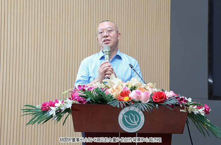中共長(zhǎng)沙市委統(tǒng)戰(zhàn)部副部長(zhǎng)、市僑辦主任楊光華就專題講座發(fā)表了見解。他認(rèn)為,《洞見的力量》這本新書的出版,匯聚了胡國(guó)安先生的一種格局和力量,這種格局是胸懷國(guó)家的,釋放出精神的力量、信仰的力量、文化的力量和智慧的力量。是對(duì)“窮者獨(dú)善其身,達(dá)者兼濟(jì)天下”最好的詮釋。胡國(guó)安先生不僅把企業(yè)做大做好,也能夠影響和帶動(dòng)身邊更多的人一起創(chuàng)業(yè),去實(shí)現(xiàn)夢(mèng)想。在他看來(lái),與“看見”二字不同,“洞見”需要的是智慧、思考,是更深的一種綜合體驗(yàn)?zāi)芰Γ芸匆妱e人看不見的東西?!抖匆姷牧α俊废蛭覀冎v述了民營(yíng)企業(yè)走向成功的十二大發(fā)展引擎,他認(rèn)為無(wú)論是過去還是當(dāng)下創(chuàng)業(yè)都是艱難的,都需要有智慧和洞見的能力和才華、需要有堅(jiān)持的力量、更需要常懷感恩之心,與善同行、與愛同行?!罢嬲拇髳?,不是簡(jiǎn)單的給予,而是去搭一座橋,鋪一條路,讓更多的人,抵達(dá)夢(mèng)想的棲息地?!币蝗鐣兴f(shuō),他勉勵(lì)大家能向胡國(guó)安先生學(xué)習(xí),繼續(xù)傳揚(yáng)和踐行家國(guó)情懷以及大愛精神,相信這本書可以點(diǎn)亮大家的創(chuàng)業(yè)夢(mèng)想,希望同學(xué)們?cè)谧龊帽韭毠ぷ鞯耐瑫r(shí),都能有余力去實(shí)現(xiàn)自己的理想,學(xué)以致用,學(xué)有所成。