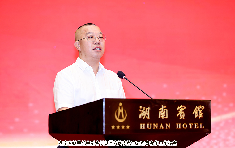 湖南省慈善總會(huì)副會(huì)長(zhǎng)、綠之韻集團(tuán)董事長(zhǎng)胡國(guó)安代表第三屆理事會(huì)作工作報(bào)告。報(bào)告指出,第三屆理事會(huì)八年來,在習(xí)近平新時(shí)代中國(guó)特色社會(huì)主義思想指引下,聚焦政治引領(lǐng),依法治善,多方募集,品牌塑造,廣泛聯(lián)動(dòng),慈善宣傳,答好忠誠(chéng)干凈擔(dān)當(dāng)“政治答卷”,答好可感可及“民生答卷”、答好群眾滿意“安全答卷”。總會(huì)募集款物23.7億元,在打贏脫貧攻堅(jiān)戰(zhàn)、新冠肺炎疫情防控和推進(jìn)鄉(xiāng)村全面振興等工作中發(fā)揮了重要作用。疫情攻堅(jiān)戰(zhàn)中,在騰訊公益等6個(gè)平臺(tái)上線“眾志成城共抗疫情”等288個(gè)網(wǎng)絡(luò)募捐項(xiàng)目,發(fā)動(dòng)5700多萬人次參加捐贈(zèng),募集2.5億元。脫貧攻堅(jiān)戰(zhàn)中,總會(huì)在51個(gè)縣實(shí)施“甜蜜蜜”羅漢果產(chǎn)業(yè)扶貧項(xiàng)目,產(chǎn)值8000多萬元,幫扶5000多戶困難群眾脫貧致富。實(shí)施“貧困群體慈善援助計(jì)劃”項(xiàng)目,募集資金1463萬,幫助困難群眾產(chǎn)業(yè)脫貧。在助醫(yī)助困活動(dòng)中,總會(huì)實(shí)施藥品援助項(xiàng)目19個(gè),藥品價(jià)值16億余元,幫扶癌癥等大病患者10萬余人次。