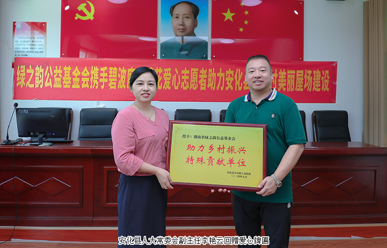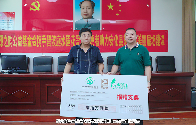 捐贈(zèng)儀式上,綠之韻集團(tuán)常務(wù)副總裁胡均安代表綠之韻公益基金會(huì)向胡家村村委捐贈(zèng)20萬(wàn)元愛(ài)心支票,安化縣人大常委會(huì)副主任李艷云回贈(zèng)愛(ài)心牌匾?!肮步ㄎ輬?chǎng)獻(xiàn)愛(ài)心,情系鄉(xiāng)村賦真情”,是胡家村全體村民對(duì)綠之韻愛(ài)心義舉的誠(chéng)摯感謝。