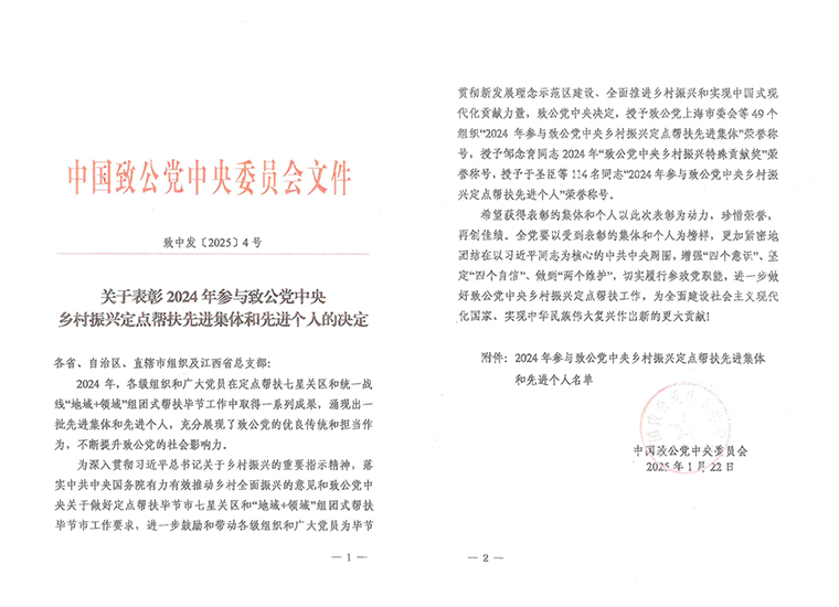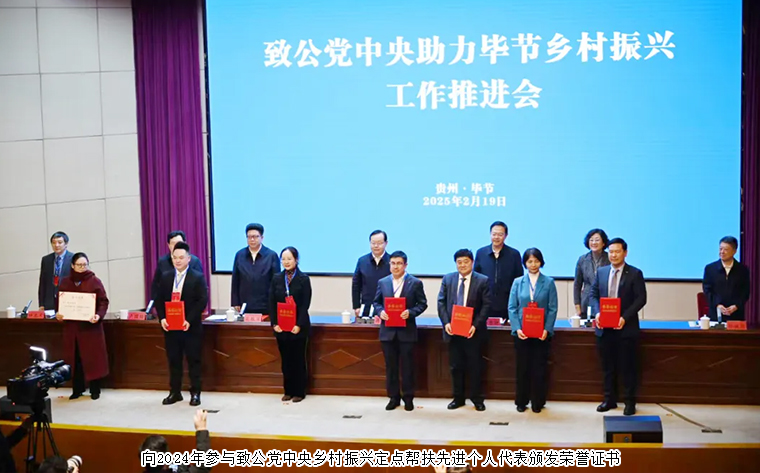 2024年,全國各級組織和廣大黨員在定點幫扶七星關(guān)區(qū)和統(tǒng)一戰(zhàn)線“地域+領(lǐng)域”組團式幫扶畢節(jié)工作中取得一系列成果,涌現(xiàn)出一批先進集體和先進個人,充分展示了致公黨的優(yōu)良傳統(tǒng)和擔(dān)當(dāng)作為,不斷提升致公黨的社會影響力。會議表彰了2024年參與致公黨中央鄉(xiāng)村振興定點幫扶先進集體和先進個人。長沙市人大代表、致公黨湖南省委會“數(shù)字互聯(lián)”委員會名譽主任、綠之韻集團董事長胡國安榮獲“2024年度致公黨中央鄉(xiāng)村振興定點幫扶先進個人”榮譽稱號。