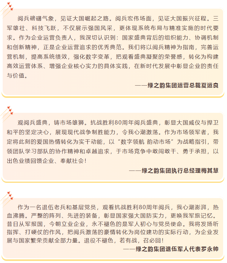 致敬偉大勝利,汲取奮進(jìn)力量。綠之韻集團(tuán)董事長胡國安在觀看閱兵儀式后表示,閱兵儀式展現(xiàn)的大國風(fēng)范和民族精神,正是綠之韻22年來砥礪前行的力量源泉。站在歷史與未來的交匯點(diǎn),我們要更加深刻認(rèn)識到企業(yè)發(fā)展與國家命運(yùn)息息相關(guān)。觀看閱兵儀式是一次深刻的愛國主義教育和精神洗禮,抗戰(zhàn)精神是企業(yè)發(fā)展不可或缺的精神財(cái)富。通過此次觀閱活動(dòng),希望全體綠之韻人要進(jìn)一步汲取歷史智慧、錘煉政治品格,將閱兵儀式所展現(xiàn)的團(tuán)結(jié)奮進(jìn)、自強(qiáng)不息的精神轉(zhuǎn)化為推動(dòng)企業(yè)創(chuàng)新發(fā)展的實(shí)際行動(dòng)。未來,綠之韻集團(tuán)將繼續(xù)深化黨建與企業(yè)發(fā)展同頻共振,引領(lǐng)公司在新時(shí)代征程中踐行社會(huì)責(zé)任、展現(xiàn)企業(yè)擔(dān)當(dāng),為實(shí)現(xiàn)中華民族偉大復(fù)興貢獻(xiàn)力量。