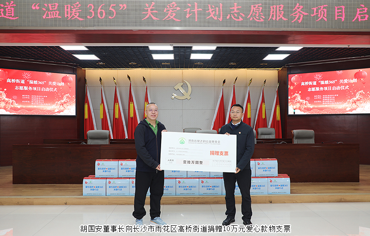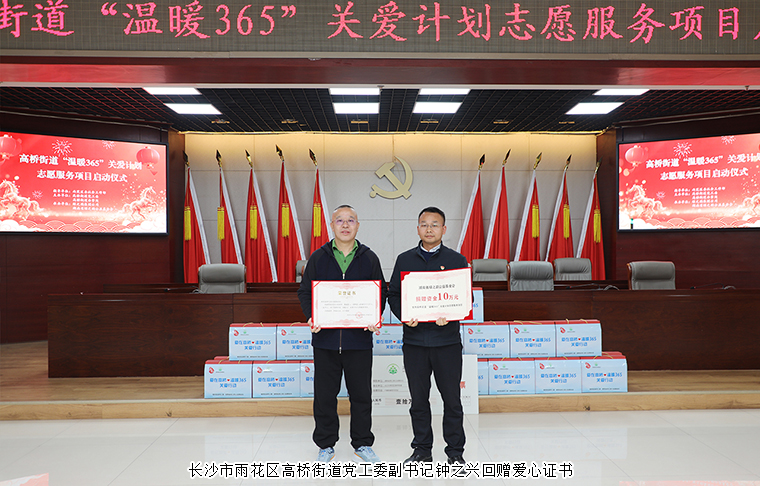 捐贈(zèng)儀式上,胡國安董事長代表公益基金會(huì)向“溫暖365”項(xiàng)目捐贈(zèng)價(jià)值10萬元的愛心款物,長沙市雨花區(qū)高橋街道黨工委副書記鐘之興代表街道接受捐贈(zèng)支票并回贈(zèng)了愛心證書。這筆充滿溫度的捐贈(zèng)將為“溫暖365”關(guān)愛項(xiàng)目的持續(xù)開展提供有力支撐。