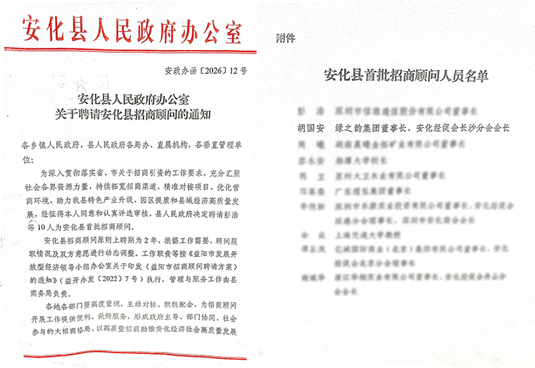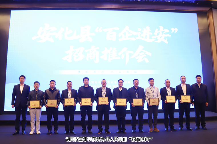 鄉(xiāng)友回歸,既要引得來,更要留得住、發(fā)展好;產(chǎn)業(yè)振興,既要搭平臺,更要聚人才、強支撐。為進一步匯聚鄉(xiāng)賢力量、拓寬招商渠道,本次招商推介會上,安化縣專門聘任10位各界精英擔(dān)任 “招商顧問”,以商引商、以情聚商,為家鄉(xiāng)高質(zhì)量發(fā)展注入更強動能。長沙市安化商會會長、綠之韻集團董事長胡國安憑借深厚的家鄉(xiāng)情懷、廣泛的行業(yè)影響力與豐富的資源優(yōu)勢,獲聘為安化縣人民政府“招商顧問”。