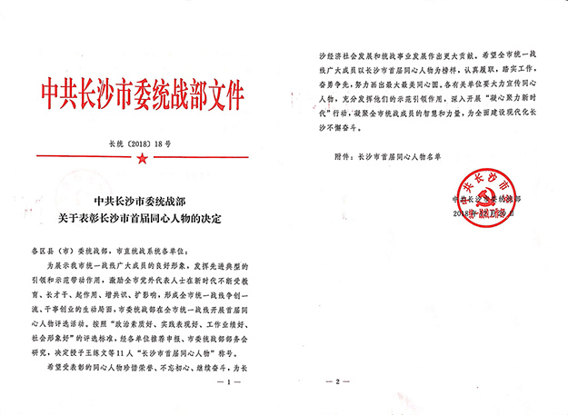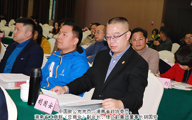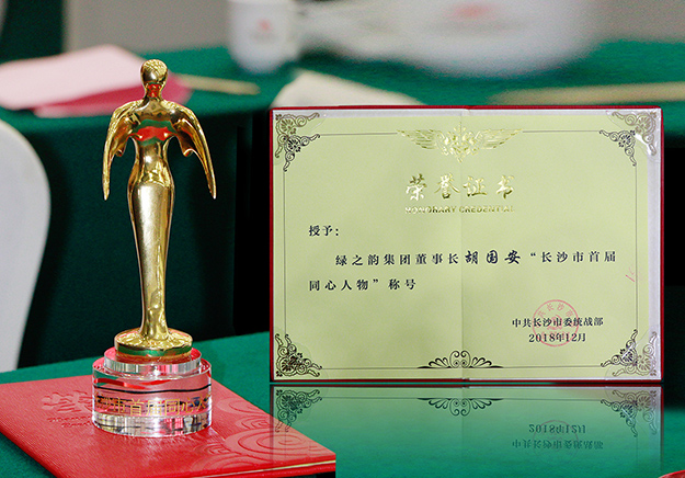 2018年12月24日,長(zhǎng)沙市首屆同心人物頒獎(jiǎng)典禮暨凝心聚力新時(shí)代行動(dòng)推進(jìn)會(huì)在長(zhǎng)沙舉行。中共湖南省委統(tǒng)戰(zhàn)部副部長(zhǎng)龍建湘,中共長(zhǎng)沙市委常委、統(tǒng)戰(zhàn)部長(zhǎng)譚小平,長(zhǎng)沙市人民政府副市長(zhǎng)、長(zhǎng)沙市知聯(lián)會(huì)會(huì)長(zhǎng)劉明理,長(zhǎng)沙市政協(xié)副主席、農(nóng)工黨市委主委龔振湘等領(lǐng)導(dǎo)出席會(huì)議。中國(guó)致公黨黨員、湖南省政協(xié)委員、湖南省工商聯(lián)(總商會(huì))副會(huì)長(zhǎng)、綠之韻集團(tuán)董事長(zhǎng)胡國(guó)安受邀出席頒獎(jiǎng)典禮,獲評(píng)長(zhǎng)沙市首屆“十大同心人物”。
