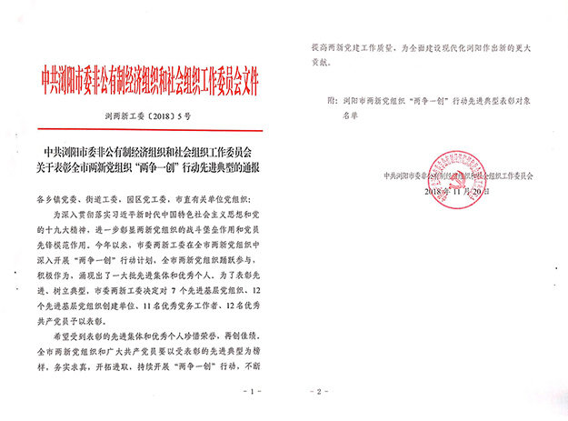 瀏陽市委兩新工委在全市兩新黨組織中組織開展“兩爭(zhēng)一創(chuàng)”行動(dòng)先進(jìn)典型評(píng)選,旨在深入貫徹落實(shí)新時(shí)代中國(guó)特色社會(huì)主義思想和黨的十九大精神,彰顯兩新黨組織戰(zhàn)斗堡壘作用和黨員先鋒模范作用。湖南綠之韻保健日用品有限公司黨支部憑借出色的黨建工作,經(jīng)基層推薦、差額比選、組織考察、綜合會(huì)審,并經(jīng)市委兩新工委會(huì)議研究,被評(píng)為瀏陽市兩新黨組織“兩爭(zhēng)一創(chuàng)”行動(dòng)“先進(jìn)基層黨組織創(chuàng)建單位”,中共瀏陽市委常委、組織部部長(zhǎng)周文舜給獲獎(jiǎng)的先進(jìn)集體頒獎(jiǎng)。