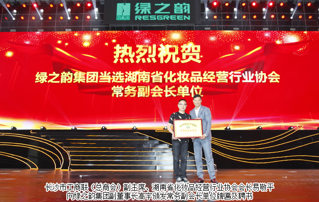 在此次大會上,湖南省化妝品經(jīng)營行業(yè)協(xié)會授予綠之韻集團(tuán)為其常務(wù)副會長單位。同時綠之韻集團(tuán)副董事長高宇先生,也將當(dāng)選為協(xié)會專職副會長。