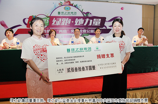 活動(dòng)現(xiàn)場(chǎng),綠之韻集團(tuán)董事總裁、綠之韻公益基金會(huì)理事長(zhǎng)勞嘉向益陽(yáng)市委統(tǒng)戰(zhàn)部捐贈(zèng)233萬(wàn)元支票。這筆愛心捐款將用于益陽(yáng)市10000名城鎮(zhèn)低保常住女性進(jìn)行“兩癌”免費(fèi)公益檢查。勞嘉總裁在講話中表示,綠之韻集團(tuán)創(chuàng)立十五年以來(lái),始終秉持“關(guān)愛生命,造福人類”的公益理念,在發(fā)展實(shí)業(yè)的同時(shí),積極承擔(dān)社會(huì)責(zé)任,產(chǎn)業(yè)富民,回饋社會(huì),踴躍參與和傾情捐助了100多項(xiàng)社會(huì)公益項(xiàng)目,累計(jì)捐贈(zèng)款物達(dá)6700多萬(wàn)元。一直以來(lái),綠之韻集團(tuán)高度重視婦女事業(yè)的發(fā)展,把守護(hù)女性健康作為企業(yè)從事大健康產(chǎn)業(yè)的一個(gè)重要努力方向。此次“綠跑·她力量 關(guān)愛女性健康——‘兩癌’免費(fèi)公益檢查活動(dòng)”,除了為益陽(yáng)10000名貧困適齡婦女免費(fèi)提供“兩癌”檢查服務(wù),還將甄選一些特別貧困的“兩癌”患病家庭施以援手,進(jìn)行精準(zhǔn)幫扶。綠跑,是綠之韻集團(tuán)將“健康跑”和“主題公益”相融合一個(gè)大型公益計(jì)劃,截至目前已經(jīng)在湖南瀏陽(yáng)、湘西吉首、長(zhǎng)沙松雅湖成功舉辦了三屆。今年6月,綠之韻集團(tuán)將繼續(xù)以“健康跑”的方式,凝聚社會(huì)各界愛心力量,廣泛關(guān)注貧困“兩癌”家庭,在宣傳“兩癌”科普知識(shí)的同時(shí),倡導(dǎo)國(guó)民在日常生活中保持健康積極的生活狀態(tài)。