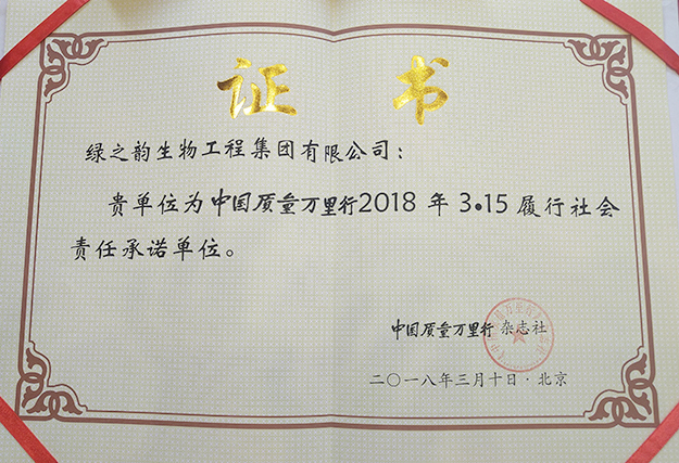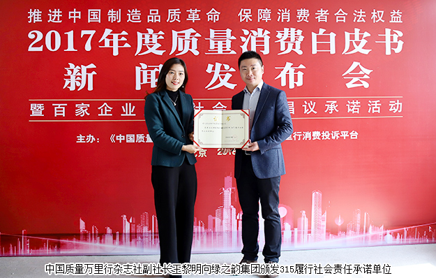 2018年3月10日,由《中國質(zhì)量萬里行》雜志社、中國質(zhì)量萬里行投訴平臺主辦的“2017年度質(zhì)量消費(fèi)白皮書新聞發(fā)布會暨百家企業(yè)履行社會責(zé)任倡議承諾活動”在北京舉行。國家質(zhì)檢總局執(zhí)法督查司司長嚴(yán)馮敏,中國質(zhì)檢報(bào)刊社社長谷旭,中國法學(xué)會消法研究會會長河山,中消協(xié)原副秘書長武高漢,中國質(zhì)檢報(bào)刊社副社長兼副總編輯李本軍,國家日用電器質(zhì)量監(jiān)督檢驗(yàn)中心副主任劉國榮,《中國質(zhì)量萬里行》雜志社社長汪鶴林、副社長王黎明等出席發(fā)布會。綠之韻集團(tuán)總裁助理蔣文代表集團(tuán)公司受邀參會。