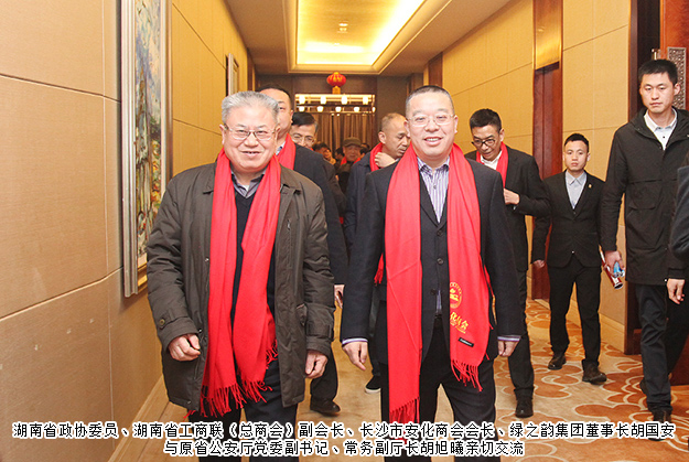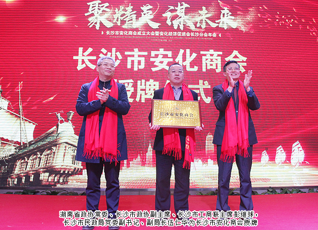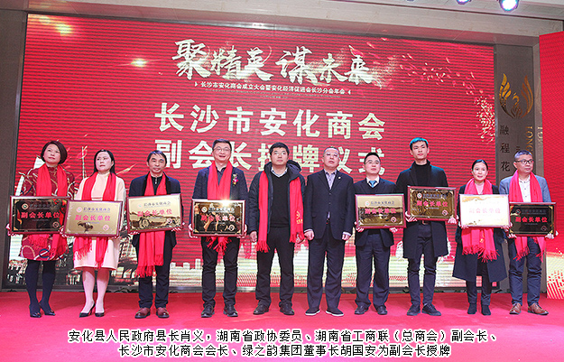 聚精英,謀未來(lái)。2018年2月4日,長(zhǎng)沙市安化商會(huì)成立大會(huì)暨安化經(jīng)濟(jì)促進(jìn)會(huì)長(zhǎng)沙分會(huì)年會(huì)在長(zhǎng)沙舉行。湖南省政協(xié)常委、長(zhǎng)沙市政協(xié)副主席、長(zhǎng)沙市工商聯(lián)主席彭繼球,中共益陽(yáng)市委常委、統(tǒng)戰(zhàn)部部長(zhǎng)周振宇,安化縣人民政府縣長(zhǎng)肖義,長(zhǎng)沙市民政局黨委副書記、副局長(zhǎng)伍仁華,中共安化縣委副書記王新宇,益陽(yáng)市人民政府駐長(zhǎng)沙辦事處主任聶超美,長(zhǎng)沙市工商聯(lián)副主席張明剛,安化縣政協(xié)副主席、總商會(huì)會(huì)長(zhǎng)李艷云,長(zhǎng)沙市社會(huì)組織管理局局長(zhǎng)李紅輝等領(lǐng)導(dǎo)嘉賓出席會(huì)議。湖南省政協(xié)委員、湖南省工商聯(lián)(總商會(huì))副會(huì)長(zhǎng)、長(zhǎng)沙市安化商會(huì)會(huì)長(zhǎng)、綠之韻集團(tuán)董事長(zhǎng)胡國(guó)安,綠之韻集團(tuán)董事、總裁勞嘉,綠之韻集團(tuán)常務(wù)副總經(jīng)理胡均安,綠之韻集團(tuán)副總經(jīng)理夏運(yùn)良受邀參加活動(dòng)。大會(huì)還邀請(qǐng)了來(lái)自深圳、廈門、株洲、益陽(yáng)等兄弟安化商會(huì)及長(zhǎng)沙各行業(yè)安化籍知名企業(yè)和精英人士 400 多人匯智聚力一堂,共謀發(fā)展大計(jì)。