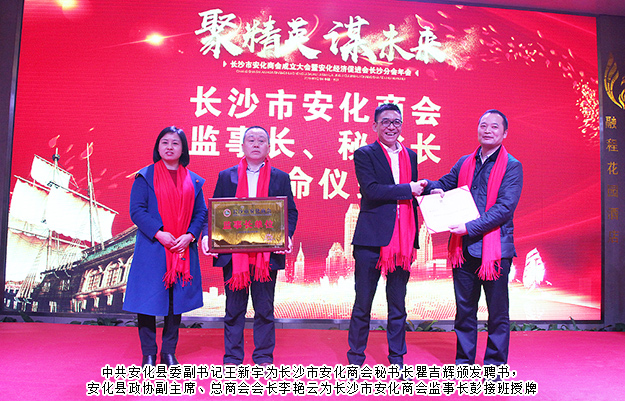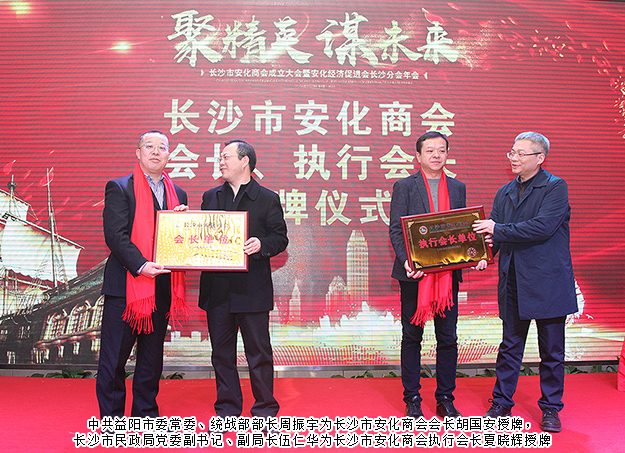 為了更好的加強(qiáng)安化籍企業(yè)家,鄉(xiāng)賢的相互聯(lián)系,更好的整合資源,打造溝通交流的平臺(tái),實(shí)現(xiàn)合作共贏,進(jìn)一步提升安化的影響力,增強(qiáng)安化人的影響力和凝聚力,安化商會(huì)應(yīng)運(yùn)而生。湖南省政協(xié)常委、長(zhǎng)沙市政協(xié)副主席、長(zhǎng)沙市工商聯(lián)主席彭繼球宣讀商會(huì)選舉結(jié)果。綠之韻集團(tuán)董事長(zhǎng)胡國(guó)安當(dāng)選長(zhǎng)沙市安化商會(huì)會(huì)長(zhǎng),夏曉輝當(dāng)選執(zhí)行會(huì)長(zhǎng),龍勝全、吳余生、夏義良、諶獻(xiàn)軍等當(dāng)選副會(huì)長(zhǎng)。與會(huì)領(lǐng)導(dǎo)為新當(dāng)選的會(huì)長(zhǎng)、執(zhí)行會(huì)長(zhǎng)、監(jiān)事長(zhǎng)授牌。同時(shí),為了表彰為安化發(fā)展做出貢獻(xiàn)的杰出代表,大會(huì)授予盧虎行等八位安化籍代表“特殊貢獻(xiàn)獎(jiǎng)”,安化經(jīng)濟(jì)促進(jìn)會(huì)長(zhǎng)沙分會(huì)理事長(zhǎng)李蒲初先生為獲獎(jiǎng)代表頒獎(jiǎng)。