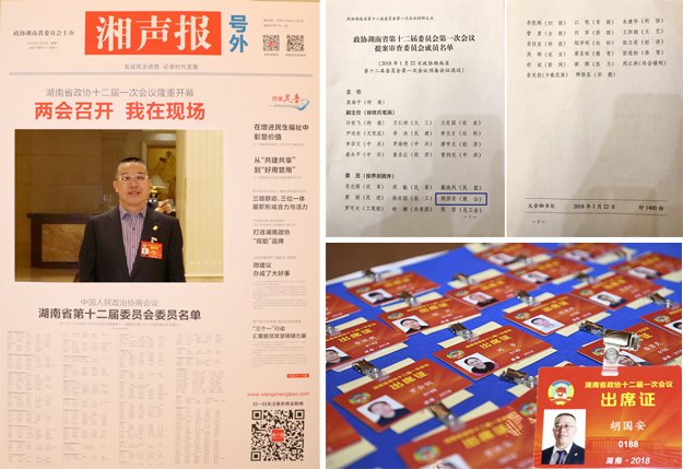 “他剛從苦難中走出來,轉(zhuǎn)身就把手伸向了后面的人。在他看來,財(cái)富僅僅是一個(gè)有增有減的數(shù)字,責(zé)任才是生命中最重要的擔(dān)當(dāng)?!边@是2016年胡國(guó)安委員榮獲“CCTV感動(dòng)中國(guó)之感動(dòng)湖南人物”的頒獎(jiǎng)詞,也是他甘于奉獻(xiàn)、建言履職的最生動(dòng)注腳。作為一名三屆“老委員”,胡國(guó)安任職第十、第十一屆政協(xié)委員期間,深入廣泛調(diào)研,積極建言獻(xiàn)策,曾先后提交了《關(guān)于推進(jìn)“互聯(lián)網(wǎng)+扶貧”模式,實(shí)施精準(zhǔn)扶貧的建議》《關(guān)于加速推進(jìn)慈善事業(yè)立法的相關(guān)建議》《關(guān)于加快我省推進(jìn)電子商務(wù)進(jìn)農(nóng)村的幾點(diǎn)合理化建議》《關(guān)于加速推進(jìn)湖南省電商網(wǎng)商發(fā)展的幾點(diǎn)建議》《關(guān)于加強(qiáng)互聯(lián)網(wǎng)管理、遏制網(wǎng)絡(luò)謠言的合理化建議》等20多件提案,涉及精準(zhǔn)扶貧、關(guān)愛青少年、電子商務(wù)、互聯(lián)網(wǎng)+、公益事業(yè)、綠色健康、低碳環(huán)保等多個(gè)社會(huì)層面,得到了省委省政府及相關(guān)部門、媒體的重視和贊譽(yù)。其中,胡國(guó)安委員在政協(xié)湖南省第十屆委員會(huì)第四次會(huì)議上代表無黨派人士的發(fā)言《積極引導(dǎo)非公有制經(jīng)濟(jì)融入“四化兩型”戰(zhàn)略的建議》受到最高人民法院院長(zhǎng)(時(shí)任中共湖南省委書記)周強(qiáng)的重要批示,并被評(píng)為“優(yōu)秀政協(xié)委員”;在政協(xié)湖南省第十一屆委員會(huì)第五次會(huì)議上,所提交的提案《關(guān)于推進(jìn)“互聯(lián)網(wǎng)+扶貧”模式,實(shí)施精準(zhǔn)扶貧的建議》被省政協(xié)表彰為“優(yōu)秀提案”。