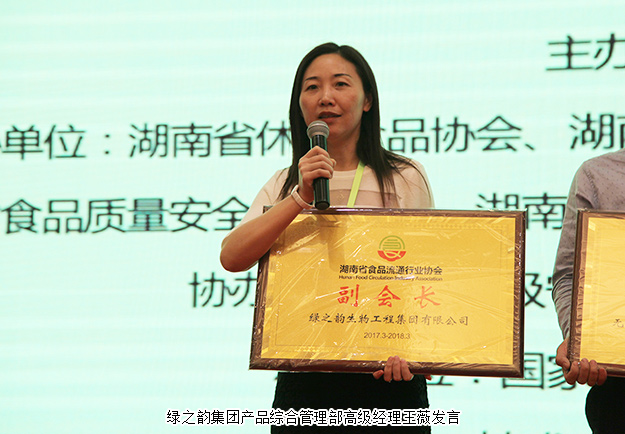 作為此次大會的壓軸環(huán)節(jié),湖南省食品流通行業(yè)協(xié)會對2016年評選出的食品誠信示范單位進行了通報表彰。綠之韻集團以質量安全意識突出、誠信經營理念突出、科學管理機制突出、產品質量水平突出、行業(yè)示范效果突出而獲得 “湖南省食品誠信示范單位”榮譽稱號。綠之韻集團產品綜合管理部高級經理王薇代表集團上臺接受頒獎。