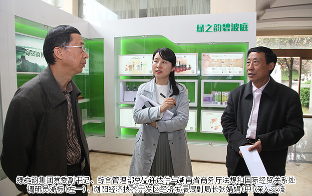 為充分融入“一帶一路”戰(zhàn)略,對(duì)接好湖南省外援培訓(xùn)工作,助推企業(yè)“走出去”和“引進(jìn)來”步伐,2017年4月7日,湖南省商務(wù)廳法規(guī)和國(guó)際經(jīng)貿(mào)關(guān)系處調(diào)研員游標(biāo)、瀏陽(yáng)經(jīng)濟(jì)技術(shù)開發(fā)區(qū)經(jīng)濟(jì)發(fā)展局副局長(zhǎng)張娟娟等一行蒞臨綠之韻集團(tuán)考察。綠之韻集團(tuán)黨委副書記、綜合管理部總監(jiān)許達(dá)仲,綠之韻集團(tuán)工會(huì)副主席、辦公室主任馮紅全程陪同。