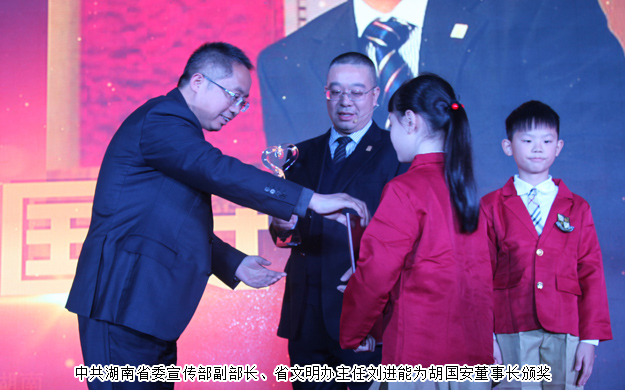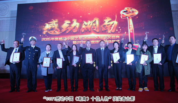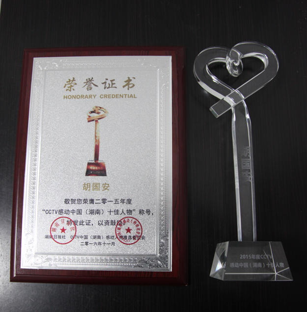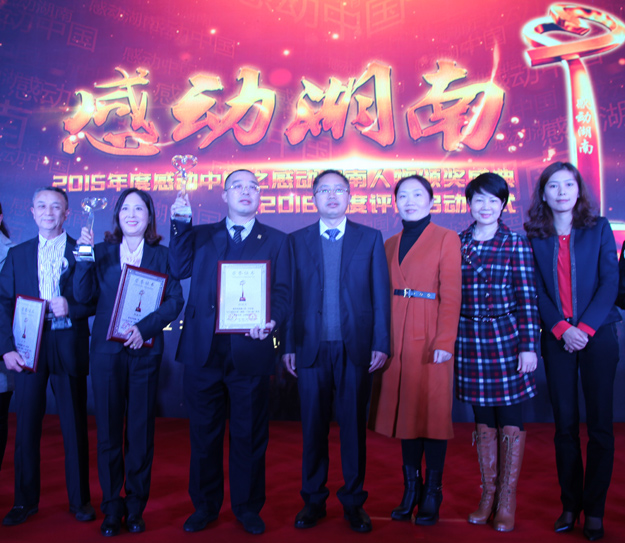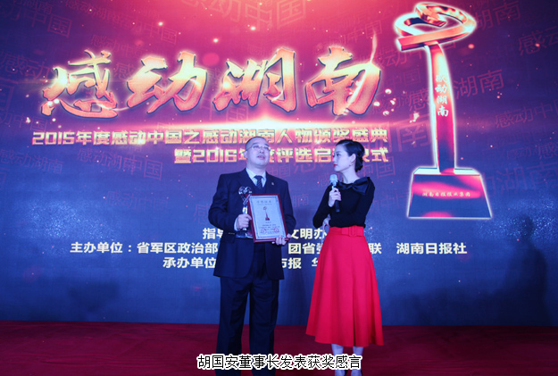 感動(dòng)中國,感動(dòng)湖南。2016年11月9日,由湖南省文明辦指導(dǎo),湖南日報(bào)社、省總工會(huì)、省軍區(qū)政治部、團(tuán)省委、省婦聯(lián)共同主辦,三湘都市報(bào)、華聲在線承辦的“2015年度感動(dòng)中國之感動(dòng)湖南人物”頒獎(jiǎng)典禮在湖南省委九所賓館隆重舉行。湖南省人大常委會(huì)副主任李友志,省人大常委會(huì)委員、教科文衛(wèi)委員會(huì)主任委員梁爾源,中共湖南省委宣傳部副部長、省文明辦主任劉進(jìn)能,省總工會(huì)黨組成員、副主席黃新民,省婦聯(lián)黨組成員、副主席魯華,湖南日報(bào)社黨組成員、副總編輯鄧獻(xiàn)忠,省軍區(qū)轉(zhuǎn)業(yè)辦主任吳湘波,省委宣傳部新聞處處長馮錦,省文明辦創(chuàng)建處處長張志輝,湖南日報(bào)社編委、三湘都市報(bào)總編輯、華聲在線常務(wù)副總裁張?jiān)茐?,省總工?huì)宣教部副部長羅偉,共青團(tuán)湖南省委宣傳部部長陳麗等出席活動(dòng)。綠之韻集團(tuán)董事長胡國安獲評(píng)2015年度“CCTV感動(dòng)中國(湖南)十佳人物”稱號(hào),中共湖南省委宣傳部副部長、省文明辦主任劉進(jìn)能為胡國安董事長頒獎(jiǎng)。
