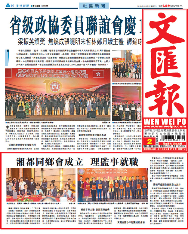 2016年11月1日,湖南香港湘都同鄉(xiāng)會(huì)在香港北角海逸君綽酒店成立。同鄉(xiāng)會(huì)號(hào)召居港老鄉(xiāng)團(tuán)結(jié)一心,共創(chuàng)美好未來。會(huì)上,來自香港的200多名湖南老鄉(xiāng)匯聚一堂,共暢友誼,共謀未來。