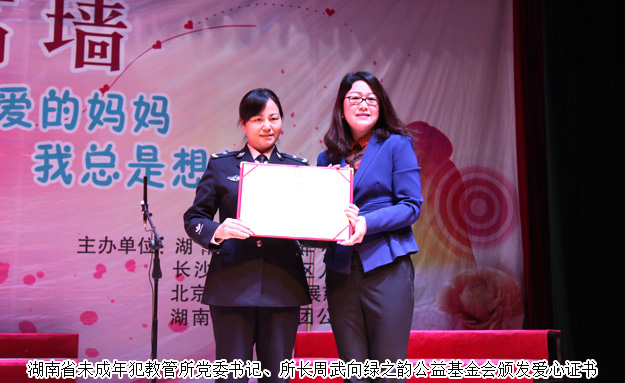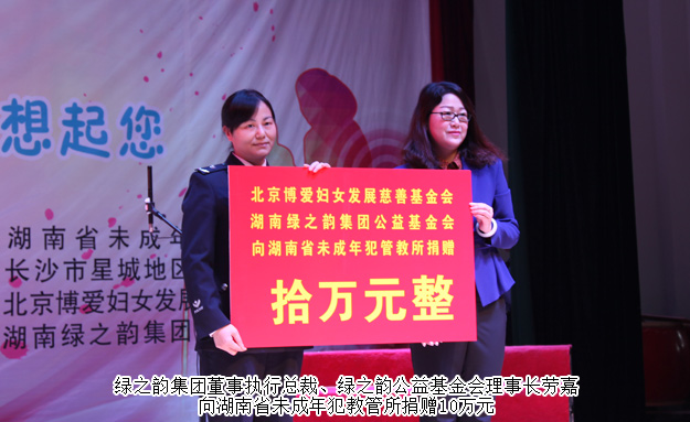 2016年5月8日,情暖高墻——綠之韻集團關(guān)愛未成年服刑人員及特困母親慰問愛心活動聯(lián)合北京博愛婦女發(fā)展慈善基金會走進湖南省未成年犯教管所。湖南省司法廳黨組成員、副廳長、省監(jiān)獄管理局黨委書記、局長方華堂,中紀委辦公廳原巡視員、慈善基金會顧問毛祚策,北京博愛婦女發(fā)展慈善基金會會長陳富剛以及湖南省未成年犯教管所領(lǐng)導(dǎo)等出席活動。綠之韻集團董事執(zhí)行總裁、綠之韻公益基金會理事長勞嘉,綠之韻集團黨總支書記劉云、綠之韻公益基金會秘書長蔣文、湖南分公司副經(jīng)理劉磊等共同參與活動。