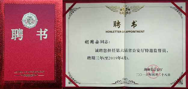 談到再次受聘為湖南省公安廳特邀監(jiān)督員,胡國(guó)安董事長(zhǎng)表示: 2008年,我首次受聘為湖南省地方稅務(wù)特邀監(jiān)察員,2012年被受聘為湖南省紀(jì)委、省監(jiān)察廳“機(jī)關(guān)效能建設(shè)和優(yōu)化經(jīng)濟(jì)發(fā)展環(huán)境監(jiān)督測(cè)評(píng)員”,2013年又被受聘為“湖南省公安廳第五屆特邀監(jiān)督員”,對(duì)特邀監(jiān)督員這個(gè)身份始終葆有一種神圣的使命感和責(zé)任感。這個(gè)聘書(shū)是沉甸甸的,跟人大代表、政協(xié)委員的身份一樣,不僅是一種光榮,更肩負(fù)著廣大普通民眾的矚托。我一定不辜負(fù)省公安廳黨委的期望,不辜負(fù)廣大民眾的重托,爭(zhēng)做稱職的、優(yōu)秀的監(jiān)督員,并充分發(fā)揮好監(jiān)督、橋梁和參謀作用,為我省公安工作和隊(duì)伍建設(shè)做出自己更大的貢獻(xiàn)。