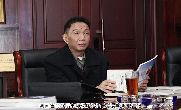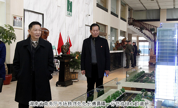 2016年1月13日,湖南省商務(wù)廳市場(chǎng)秩序處處長(zhǎng)傅晨曦、副處長(zhǎng)周建文一行蒞臨綠之韻集團(tuán)調(diào)研考察,綠之韻集團(tuán)董事長(zhǎng)胡國(guó)安、董事執(zhí)行總裁勞嘉、外事總監(jiān)黃莎莎全程陪同。