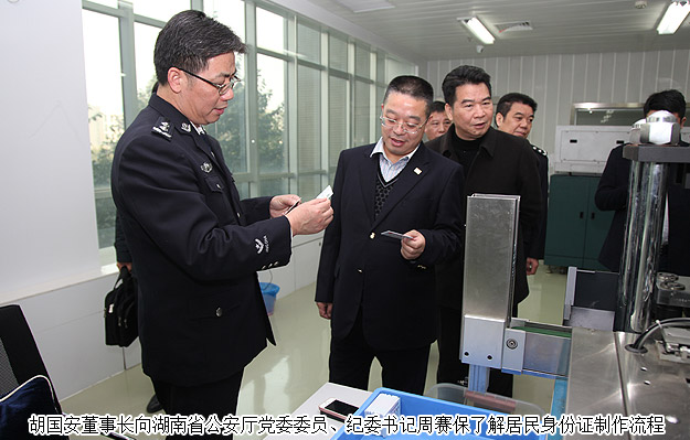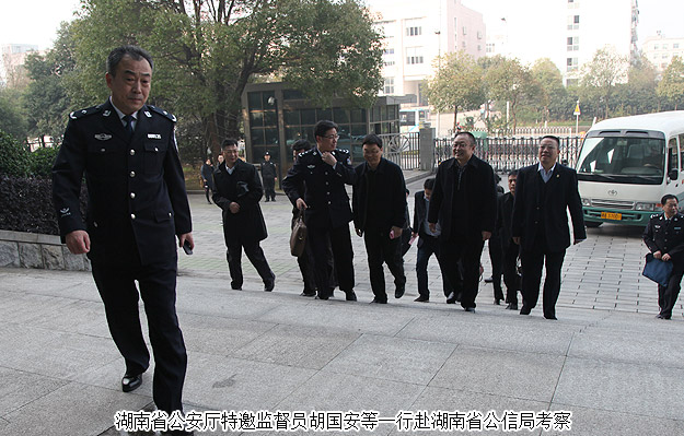 2015年12月25日下午,湖南省政協(xié)委員、省公安廳特邀監(jiān)督員、綠之韻集團董事長胡國安隨同湖南省公安廳黨委委員、紀(jì)委書記周賽保,省公安廳副廳級干部徐發(fā)科,省公安廳紀(jì)委副書記宋紅兵,省公安廳治安總隊政委高洪金,省公安廳刑偵總隊政委馮偉儉,省公安廳交警總隊紀(jì)委書記周軍,省公安廳人口與出入境管理局副局長侯占先,省公安廳警令部研究室主任胡湘文,省公安廳政治部人事處副處長文南等一行赴湖南省公民信息管理局考察。