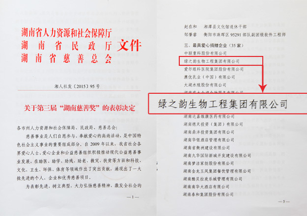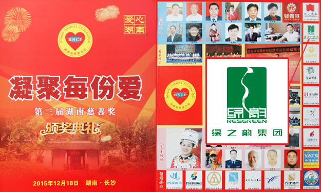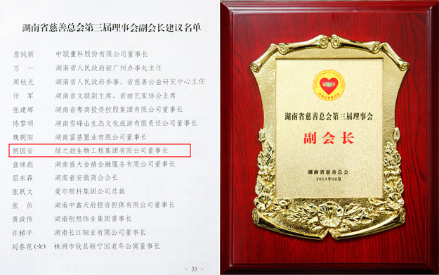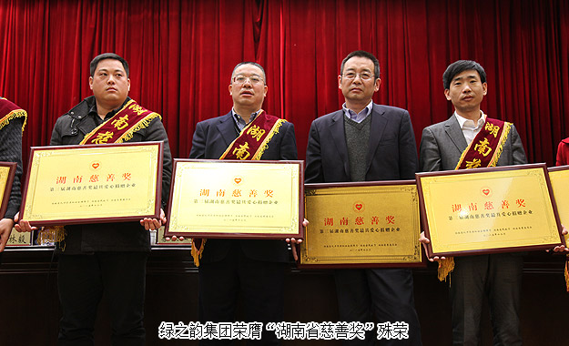 2015年12月18日上午,湖南省慈善總會(huì)第三次會(huì)員代表大會(huì)暨第三屆“湖南慈善獎(jiǎng)”表彰大會(huì)在長(zhǎng)沙舉行。中華慈善總會(huì)副會(huì)長(zhǎng)李宏塔,中華慈善總會(huì)秘書長(zhǎng)邊志偉,湖南省政協(xié)原主席、省慈善總會(huì)第二屆理事會(huì)會(huì)長(zhǎng)王克英,湖南省人民政府副省長(zhǎng)蔡振紅,湖南省人民政府副秘書長(zhǎng)王光明,湖南省民政廳廳長(zhǎng)、黨組書記、省社會(huì)組織黨工委書記段林毅,湖南省民政廳巡視員、省社會(huì)組織黨工委副書記李勁夫等出席會(huì)議。會(huì)上,因?yàn)樵诠娲壬剖聵I(yè)中做出的重大貢獻(xiàn),湖南省工商聯(lián)(總商會(huì))副會(huì)長(zhǎng)、湖南省光彩事業(yè)促進(jìn)會(huì)副會(huì)長(zhǎng)、長(zhǎng)沙光彩基金會(huì)理事長(zhǎng)、綠之韻集團(tuán)董事長(zhǎng)胡國(guó)安當(dāng)選湖南省慈善總會(huì)副會(huì)長(zhǎng);綠之韻集團(tuán)被湖南省人力資源和社會(huì)保障廳、省民政廳、省慈善總會(huì)聯(lián)合授予“湖南省慈善獎(jiǎng)最具愛(ài)心捐贈(zèng)企業(yè)”殊榮。