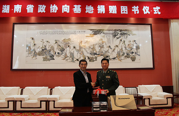 24日,“湘水情長(zhǎng)”——湖南省政協(xié)委員文化擁軍活動(dòng)捐贈(zèng)儀式在酒泉衛(wèi)星發(fā)射基地東風(fēng)賓館舉行,湖南省政協(xié)副主席張大方代表省政協(xié)向基地負(fù)責(zé)同志贈(zèng)送圖書(shū)(目錄)、筆記本電腦、電子書(shū)等,并向參加捐贈(zèng)的委員單位頒發(fā)證書(shū)。基地負(fù)責(zé)同志致答謝詞,對(duì)湖南省政協(xié)的文化擁軍活動(dòng)表示贊賞,并表示將推動(dòng)湖南雙擁工作的開(kāi)展。