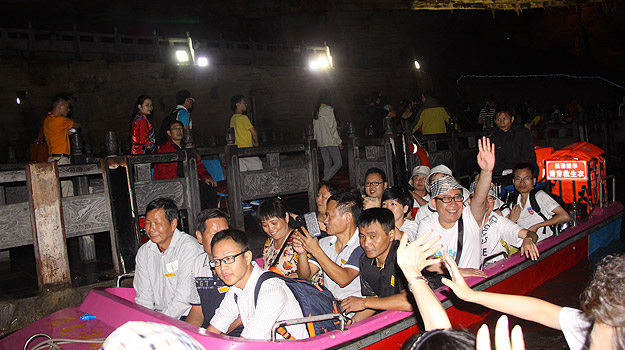 第一站家人們來到了有著“世界溶洞奇觀”、“世界溶洞全能冠軍”、“中國最美旅游溶洞”等美譽的黃龍洞,以其龐大的立體結(jié)構(gòu)洞穴空間、豐富的溶洞景觀、水陸兼?zhèn)涞挠斡[觀光線路獨步天下。黃龍洞猶如一株株古木錯節(jié)盤根、洞中有洞,洞中有河、無奇不有,真乃名副其實的“地下魔宮”,洞中還有投保一億元的石筍定海神針、響水河、龍王聚會廳,天仙水、天柱街等著名景點。最讓綠之韻家人開心和興奮的是洞內(nèi)能乘坐小船劃行,一邊劃船一邊感受無比震撼的溶洞奇觀。