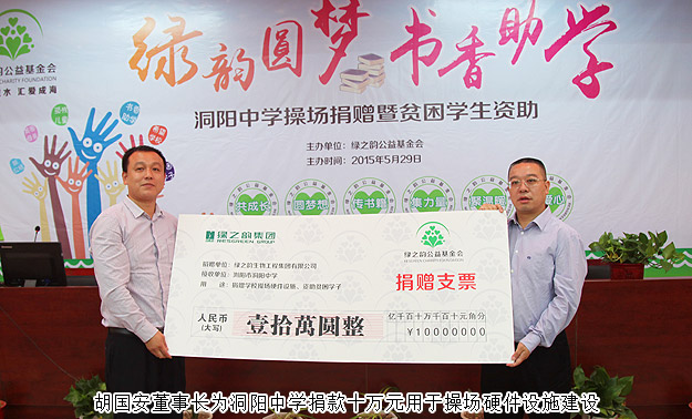 瀏陽市洞陽中學是綠之韻工業(yè)園希望小學的直升中學,學校根據(jù)發(fā)展需要,決定更換原來的水泥操場為塑膠操場。當?shù)弥獙W??嘤谫Y金困難,胡國安董事長代表綠之韻表示,將無償為學校捐建塑膠操場,為孩子們提供一個安全、舒適的運動環(huán)境,為學校全面提升辦學品位和全面實施素質(zhì)教育創(chuàng)設(shè)良好環(huán)境。捐贈儀式上,湖南綠之韻公益基金會理事長勞嘉發(fā)表致辭,她表示:少年強則國強,青少年是祖國的未來,為學校捐建操場,為孩子們配備體育器材,給貧困學子給予經(jīng)濟資助,是綠之韻十二年來關(guān)注教育事業(yè)的舉措之一。綠之韻希望通過這份愛心激勵莘莘學子努力學習,同時能夠起到拋磚引玉的作用,使社會更加重視知識和教育,關(guān)心人才的培養(yǎng)。她希望學子們在學習文化知識的同時加強體育鍛煉,要學習好、身體好、品德好,健康快樂地成長,將來做對國家有用的人。