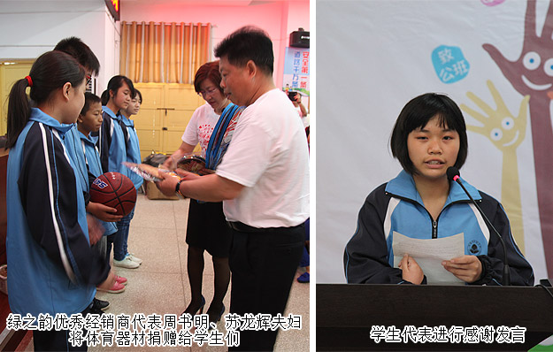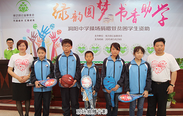 2015年5月28—29日,綠之韻“綠韻圓夢?書香助學”活動走進瀏陽洞陽中學。為了改善青少年教育教學環(huán)境,共同關(guān)注孩子們健康成長,活動當天,湖南省光彩事業(yè)促進會副會長、長沙市光彩事業(yè)基金會理事長、綠之韻集團董事長胡國安先生代表湖南綠之韻公益基金會向洞陽中學捐贈10萬元愛心款項用于該校愛心操場的建設(shè)。28日上午,湖南綠之韻公益基金會理事長、董事常務(wù)副總裁勞嘉女士與綠之韻優(yōu)秀經(jīng)銷商周書明、蘇龍輝夫婦一起走訪了學校貧困學子的家庭,并給予經(jīng)濟資助。29日,湖南綠之韻公益基金會又將一批體育器材親手送到了學生手中。綠之韻集團黨總支部書記許達仲,湖南綠之韻公益基金執(zhí)行秘書長蔣文,綠之韻集團辦公室主任馮紅,瀏陽經(jīng)濟開發(fā)區(qū)團委副書記、綠之韻集團團支部書記李倩婷,湖南分公司業(yè)務(wù)經(jīng)理劉磊,帶領(lǐng)綠之韻黨團成員以及近百位愛心經(jīng)銷商參與活動。