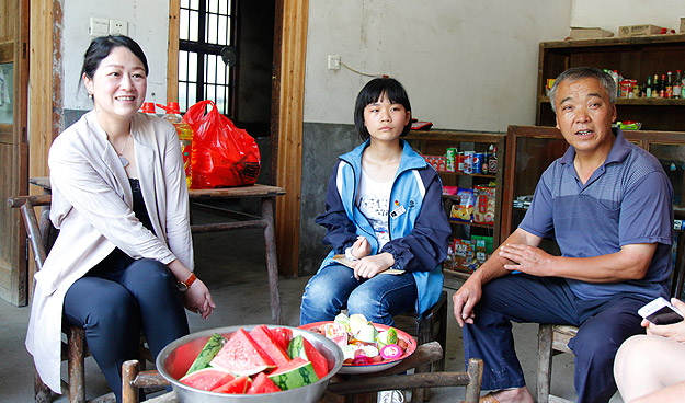 愛心志愿者一行快到達洞陽中學時,遠遠就看見一個穿著校服的嬌弱女孩,左手抱著一個圓滾滾的西瓜。看見我們走近了,怯怯地笑了笑。站在一旁的班主任說:鄧莎是個乖巧、懂事、樂觀、上進的孩子。
