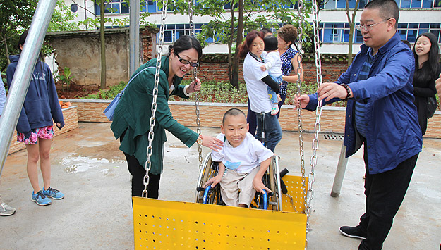 隨后,綠之韻愛心志愿者們與分配的小家庭一起,分組陪伴孩子們從新家院子到游樂場玩耍,同孩子們一起用餐和學(xué)習(xí)。雖然一些孩子動作遲鈍、在語言交流上有一些困難,但孩子們很快和熱情的綠之韻的愛心志愿者們打成一片,玩得非常開心。胡國安董事長和勞嘉副總裁親自為坐在輪椅上的小朋友系上特制秋千的綁帶,讓他們也感受到在秋千上飛起來感覺,孩子們的笑聲感染了現(xiàn)場每一個人。
