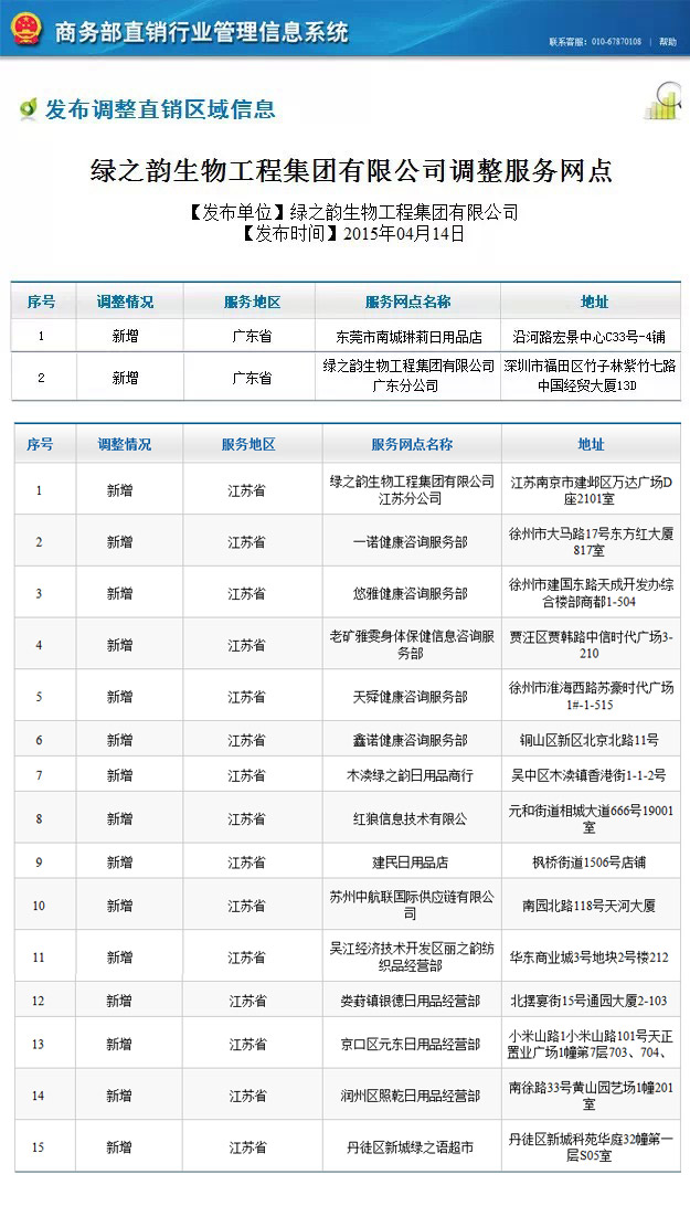 綠之韻集團再傳直銷增區(qū)喜訊。據(jù)國家商務(wù)部直銷行業(yè)管理信息系統(tǒng)網(wǎng)站公示,綠之韻集團新增廣東省、江蘇省作為直銷經(jīng)營區(qū)域已獲國家商務(wù)部批準。